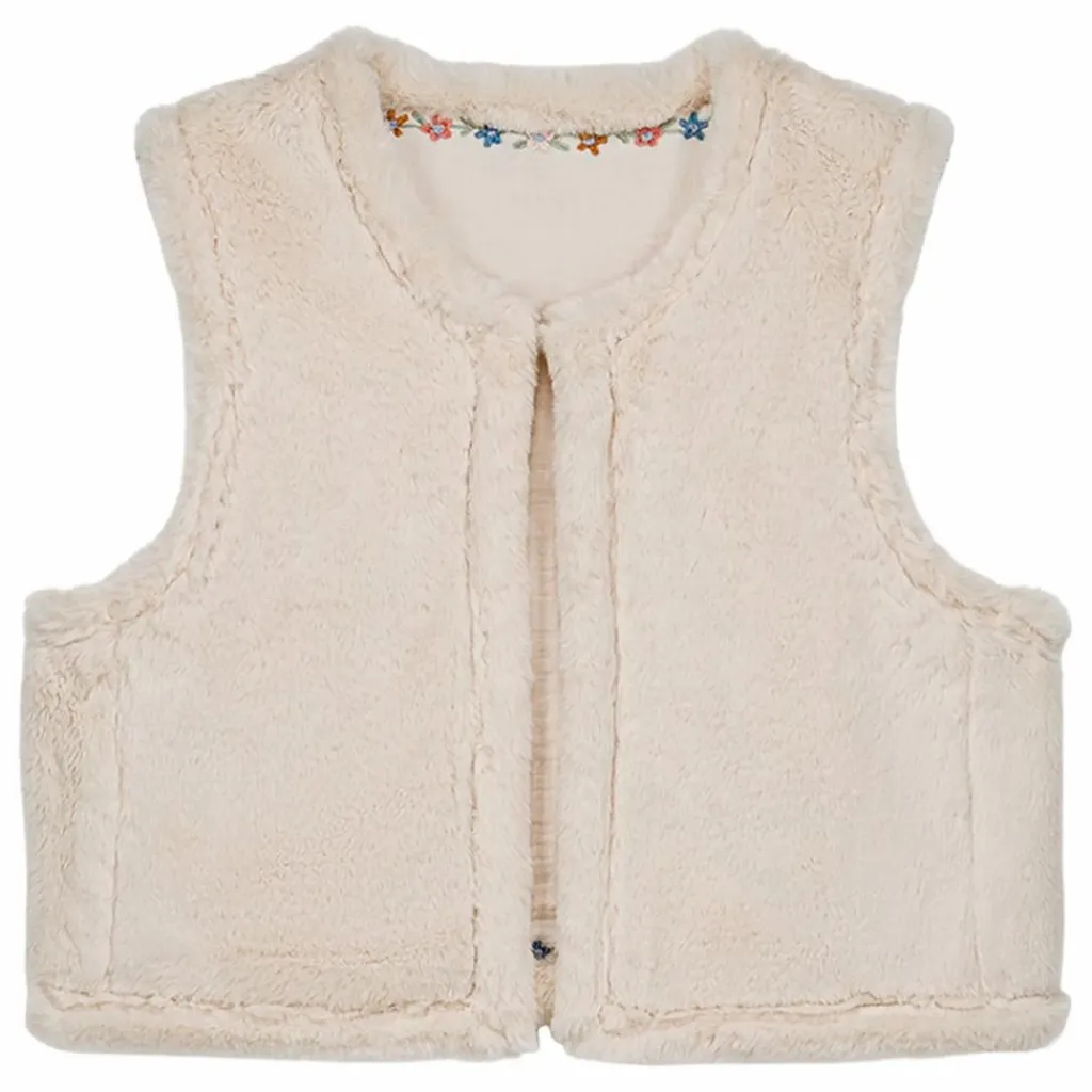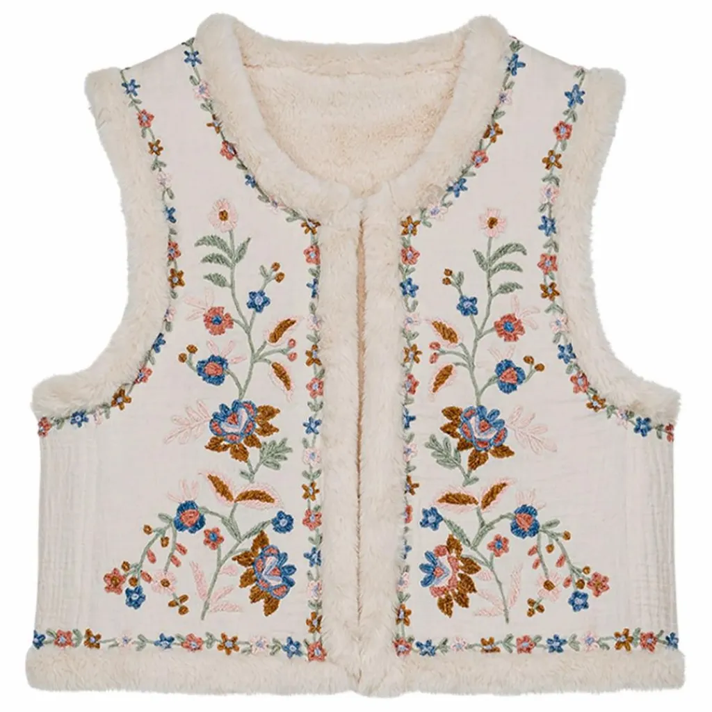 Une face en gaze de coton brodée, et une face en fausse fourrure.