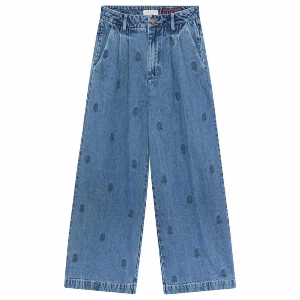 - Denim de coton à la coupe généreuse, dont les plis apportent aisance et mouvement. Le tissu, doux au toucher, dégage une sérénité patinée par les saisons. De sombres motifs brodés parsèment le bleu délavé, rappelant les tampons indigo d’époque. Leur disposition crée un rythme subtil, en contraste discret avec la structure du denim à jambe large. Ici associé à un pull torsadé, une blouse Filippa et le blazer ajusté Jackie — un mélange équilibré entre confort et raffinement. Se porte tout aussi bien avec une chemise rentrée pour une allure plus structurée.