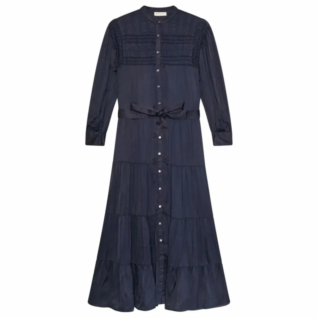 Confectionnée dans la même matière 100 % viscose que notre chemisier Aida, best-seller de l’automne-hiver 2024, elle est fluide, fraîche au toucher et d’un éclat discret qui se reflète dans la lumière. Son bleu marine profond, proche de l’encre, évoque le calme de la nuit.