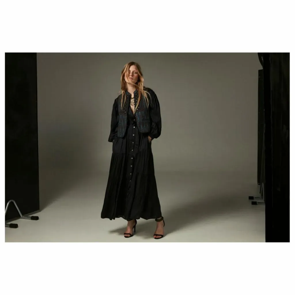 Les manches amples se rejoignent en poignets fins, tandis que la silhouette longue se compose de volants qui s’élargissent vers l’ourlet. La ceinture assortie souligne la taille si nécessaire, mais la robe peut être laissée ample pour une aisance optimale.