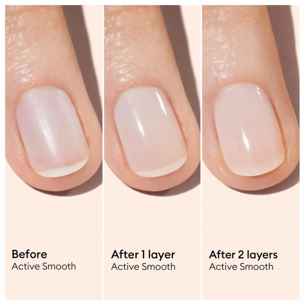 Active Smooth est le premier vernis soin lissant, une CC Polish hybride à 80% d’ingrédients bio-sourcés. Enrichi en fibres de ricin, il gomme instantanément les imperfections et les stries pour une surface d’ongle lisse. Sa teinte nude offre un fini satiné élégant en un seul passage.