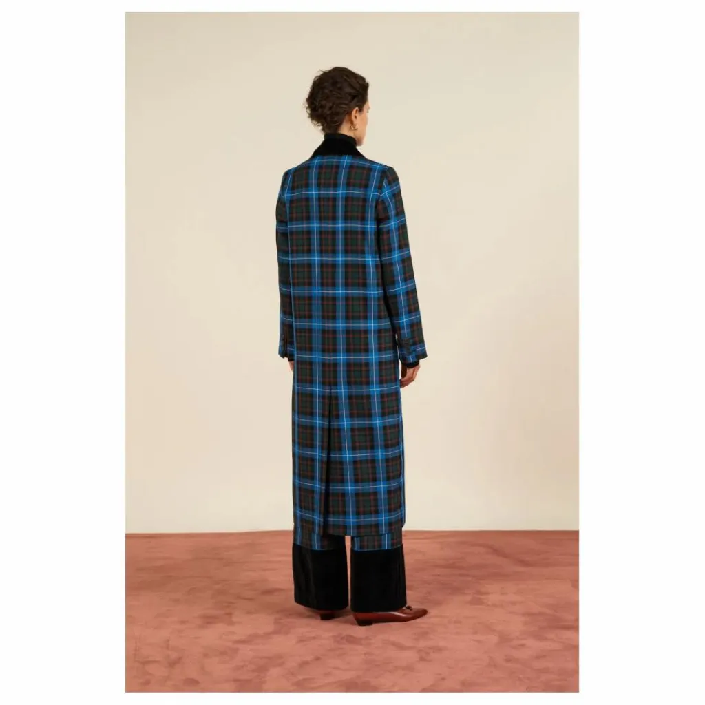 - Ce manteau long présente un motif tartan bleu et noir et des revers en velours noir. Sa coupe ajustée et son double boutonnage lui confèrent une allure à la fois classique et moderne.