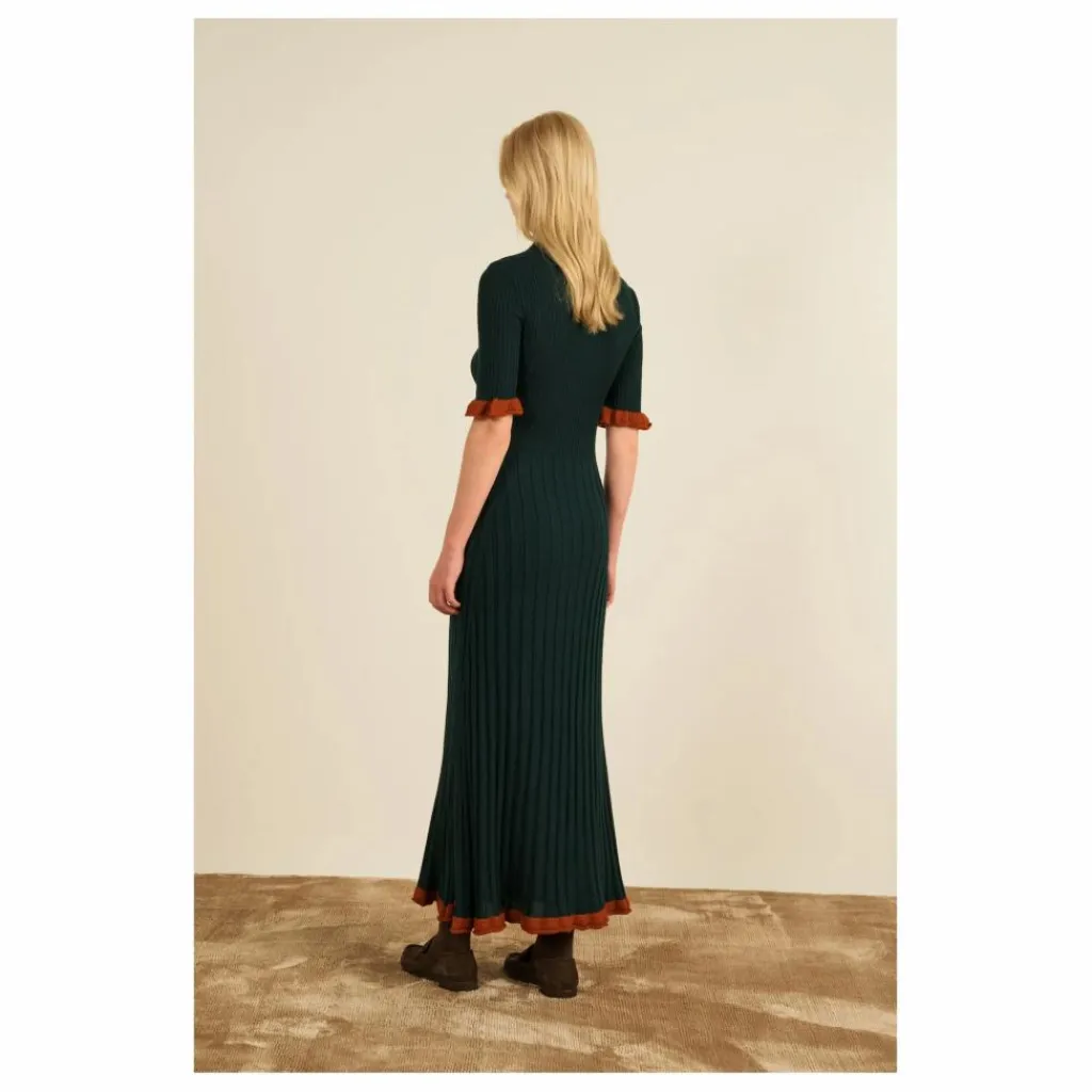 - La robe Magda est une robe longue, tricotée et près du corps avec un col rond – Elle a de petits volants bordeaux sur les manches et le bas de la robe – Réalisée en laine mérinos vert foncé