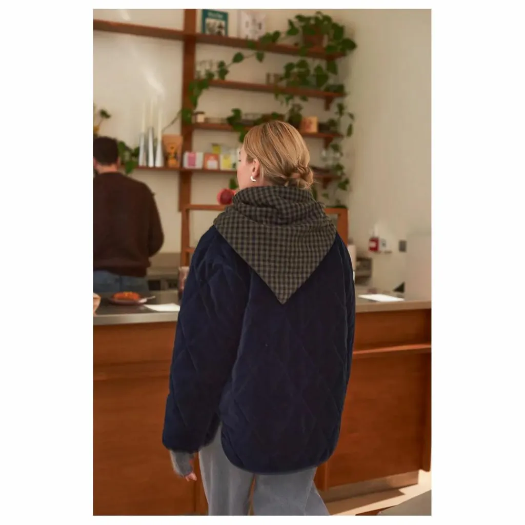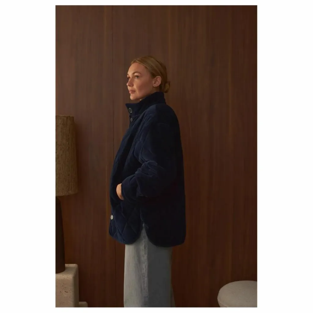 - Le manteau Louisa allie allure rétro et confort moderne grâce à son velours matelassé 100 % coton et son rembourrage en ouate. Son coloris indigo profond apporte une élégance intemporelle, tandis que sa coupe ample, son col montant et sa fermeture boutonnée assurent chaleur et praticité. Un essentiel cocooning pour affronter les journées fraîches avec style