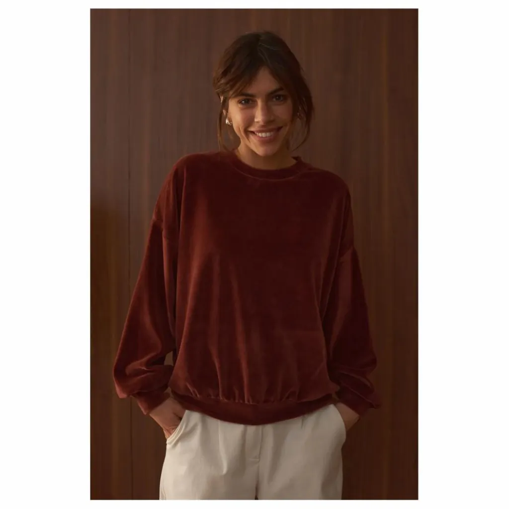 - Le sweat femme élégant et casual.On aime sa coupe légèrement loose et les manches froncées aux poignets. Un modèle ultra confortable en molleton de coton