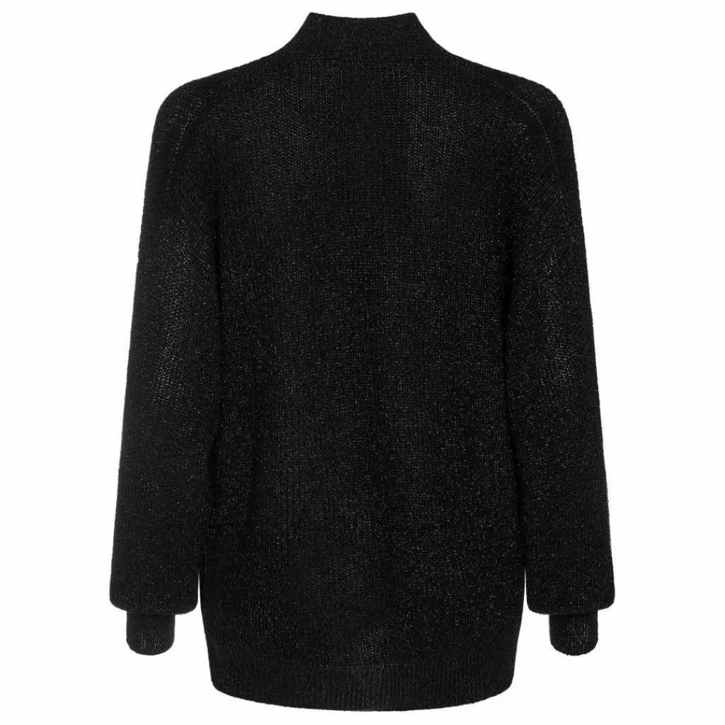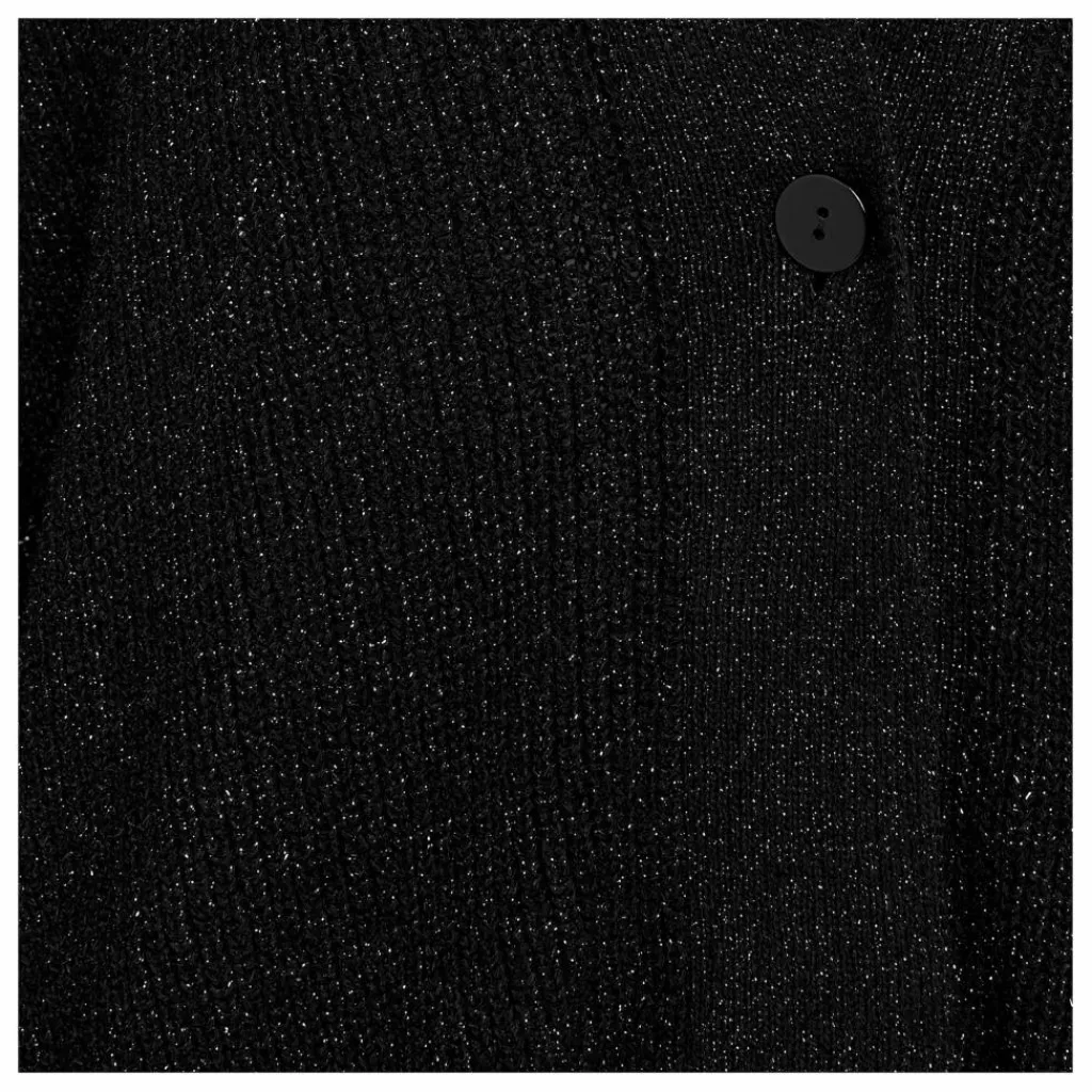 - Cardigan avec ajustement au point épi travaillé à l’avant du fil de viscose matallizzata. Bord à bande en côte élastique 1×1. Bas de la manche et du dessus en côtes 1×1. Boutonnage à un bouton en nacre.