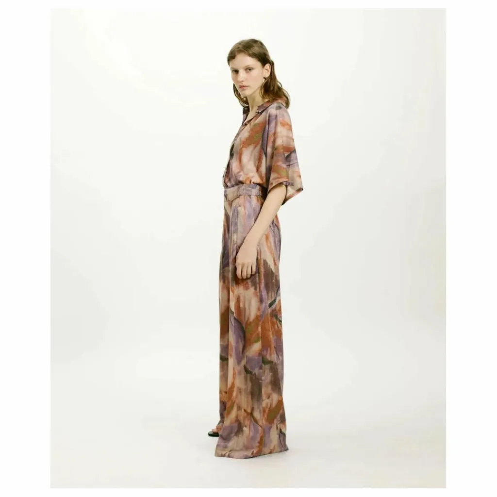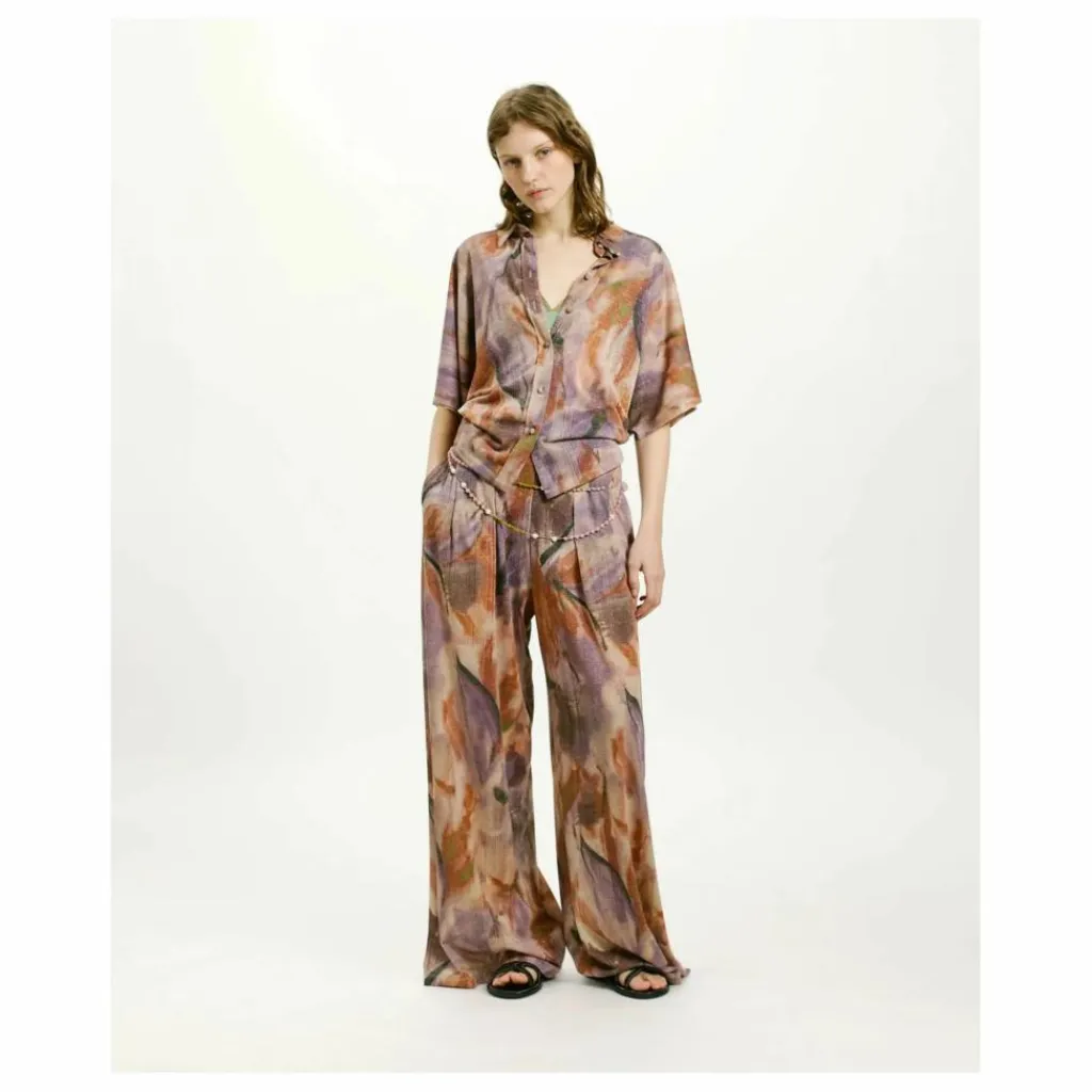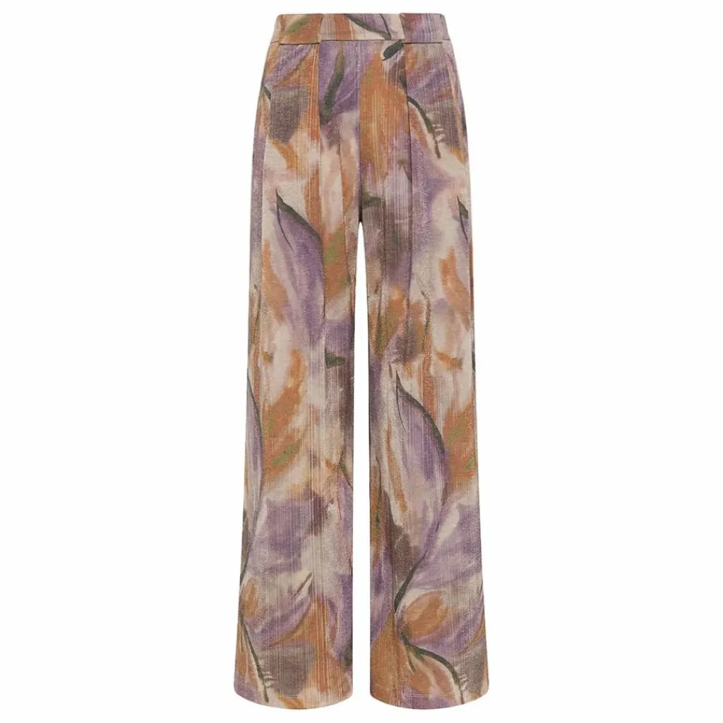 - Pantalon en jersey lurex, large. Plis avant maintenus par de grandes boucles, poches latérales et ceinture élastiquée au dos.