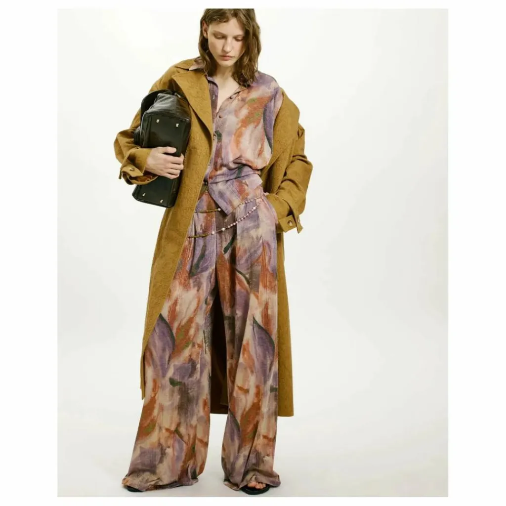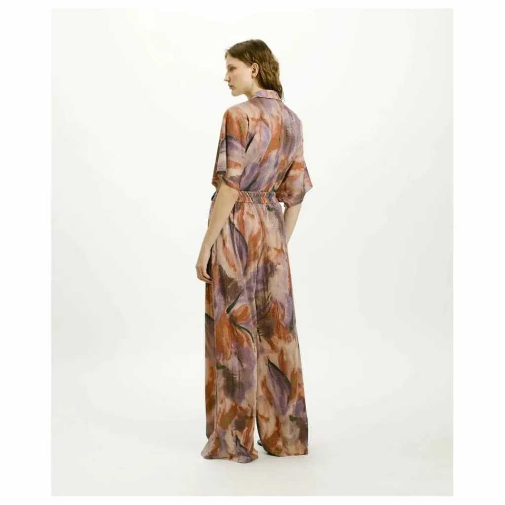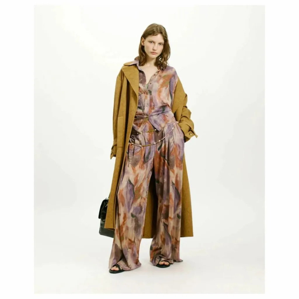 - Pantalon en jersey lurex, large. Plis avant maintenus par de grandes boucles, poches latérales et ceinture élastiquée au dos.