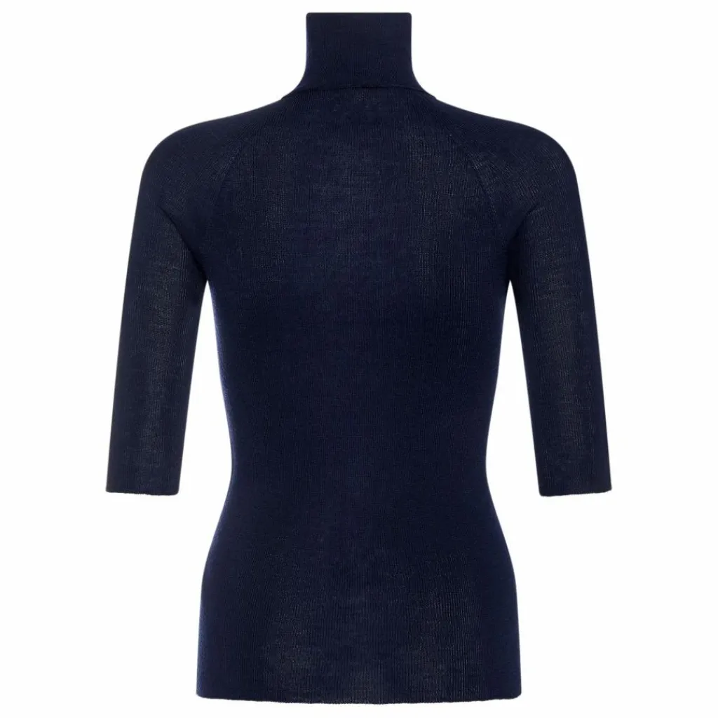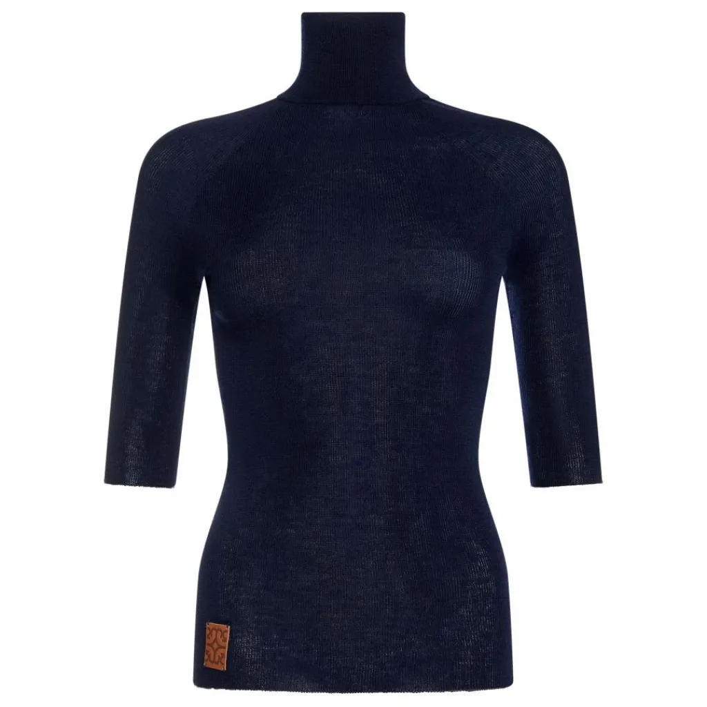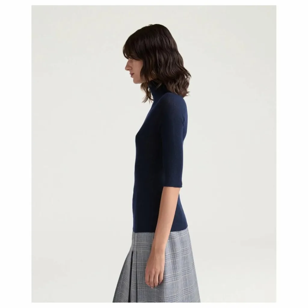 - T-shirt à col roulé en tricot côtelé de fil 100% laine mérinos. Manches courtes en raglan avec des pointes à vue. Mini étiquette logée en cuir à l’extrémité de la tête.