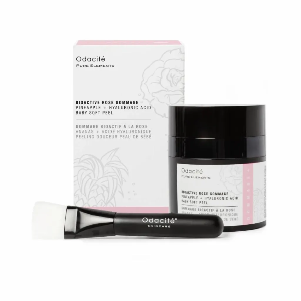 Le soin Bioactive Rose Gommage de la marque Odacité est un gel enzymatique exfoliant, hydratant et calmant pour faire peau neuve sans jamais irriter. Peau rêche, teint gris et fatigué, stress… les maux des temps modernes ! Odacité a formulé son Gommage bioactif à la rose afin d’y remédier, en alliant la puissance exfoliante des enzymes d’ananas et de papaye – pour affiner le grain de la peau en améliorant l’aspect des pores, tout en unifiant l’apparence du teint -, renforcée par les bienfaits régénérants de l’acide hyaluronique, l’effet purifiant de la racine de konjac et le pouvoir apaisant de l’eau de rose. Débarrassée des peaux mortes et impuretés, la peau devient douce, soyeuse, plus lumineuse. Une vraie peau de bébé !
