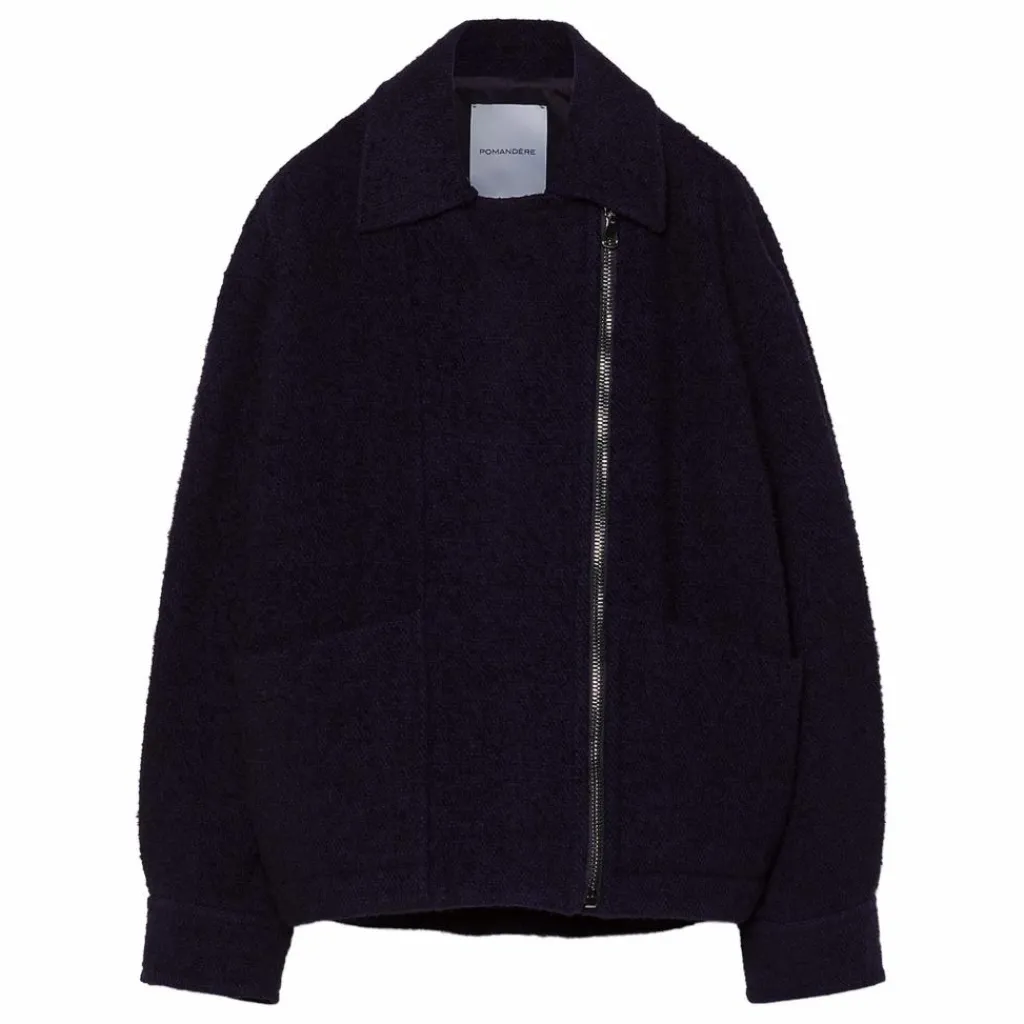 - Une silhouette contemporaine définit l’attitude décontractée du caban en bouclé bicolore en mélange de laine. Le tissu au goût urbain met en valeur l’aspect informel du vêtement, caractérisé par des surpiqûres et une fermeture façon perfecto. La coupe offre des volumes confortables avec des épaules légèrement tombantes.