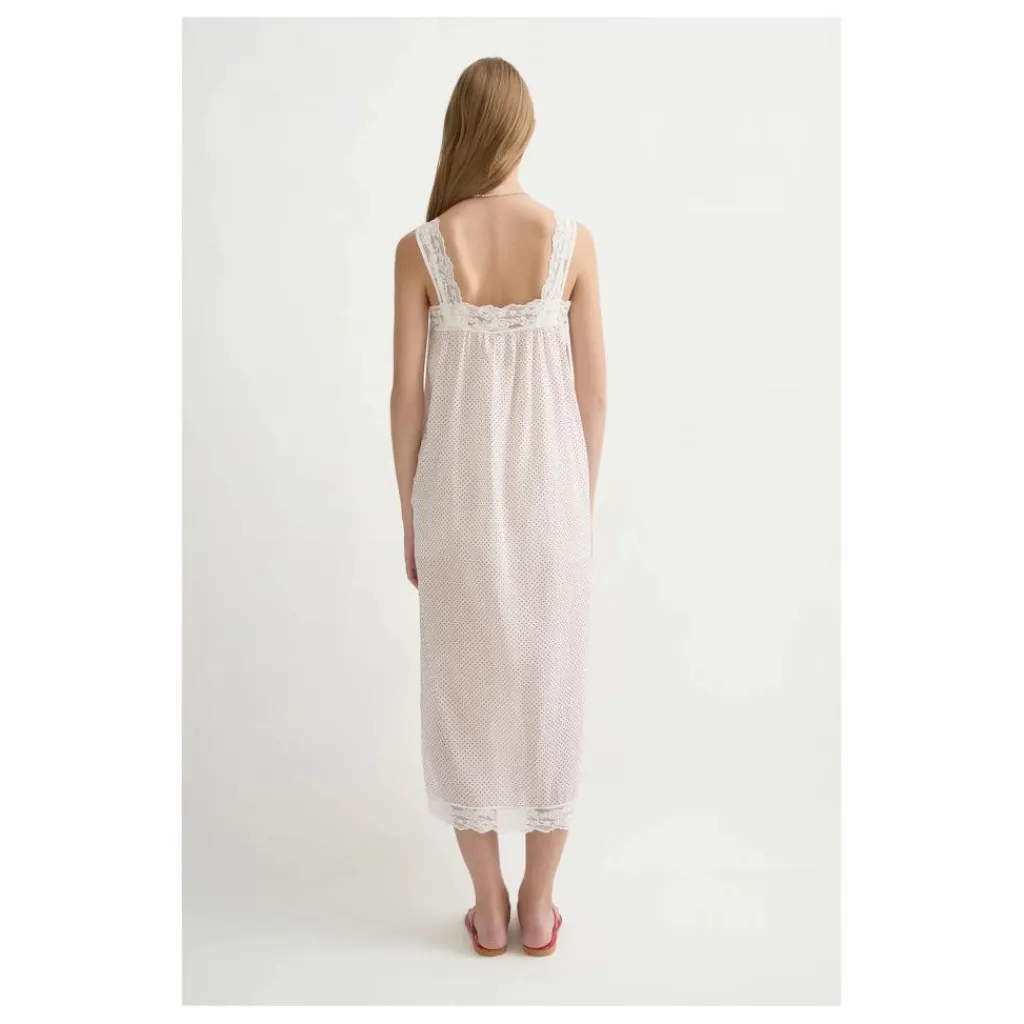 - – DÉTAILS EN DENTELLE – ENCOLURE CARRÉE – COUPE DÉCONTRACTÉE – LONGUEUR MIDI – OURLET FENDU SUR LES COUTURES LATÉRALES – DOUBLÉE