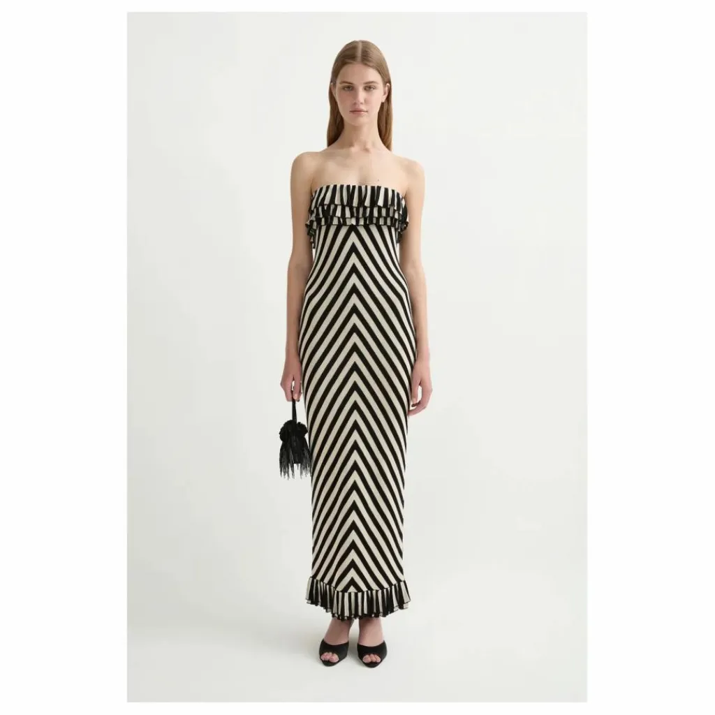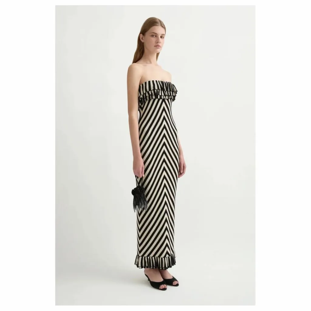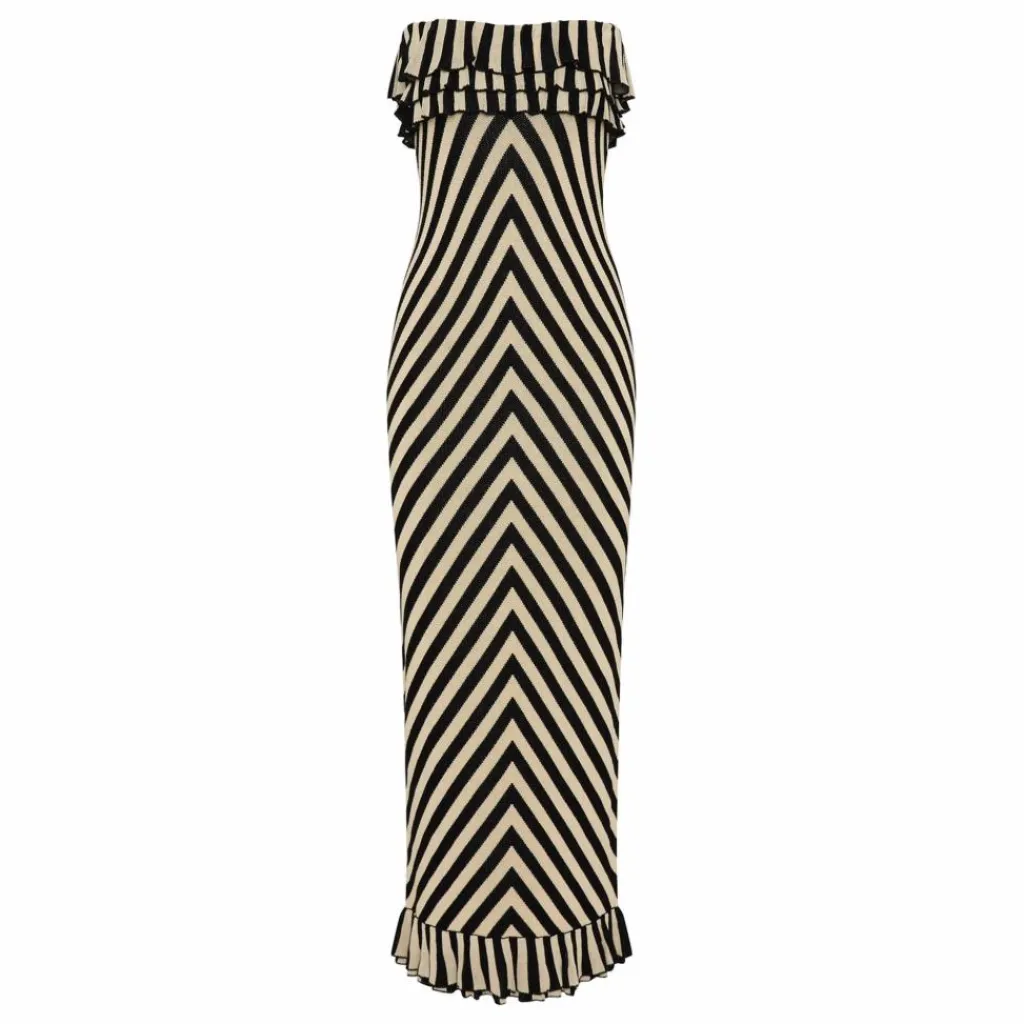 - CONNUE POUR SES ÉTONNANTES ADAPTATIONS DES RAYURES CRÈME ET NOIRES, LA ROBE BUSTIER MILES EST UN CLASSIQUE DE LA MAILLE. AVEC SES RAYURES DIRECTIONNELLES QUI ENVELOPPENT ÉLÉGAMMENT LE CORPS ET SES VOLANTS LUDIQUES, CETTE ROBE ALLIE STYLE ET CONFORT SANS EFFORT. LA DOUCEUR SUBTILE DE LA MAILLE EN FAIT UN CHOIX IDÉAL POUR LES ESCAPADES PAR TEMPS CHAUD, VOUS PERMETTANT DE FAIRE VOS VALISES EN UN RIEN DE TEMPS POUR DES VACANCES SANS EFFORT.