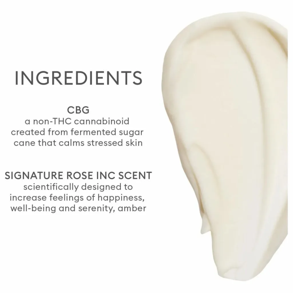 - CBG, un cannabinoïde sans THC créé à partir de canne à sucre fermentée qui calme la peau stressée ; SIGNATURE ROSE INC SCENT, scientifiquement conçu pour augmenter les sentiments de bonheur, de bien-être et de sérénité ; SQUALANE, hydratant pur, durable et 100 % dérivé des plantes qui ajoute une hydratation sans poids ; SNOW MUSHROOM EXTRACT, fournit une hydratation intense en retenant 500 fois son poids en eau.