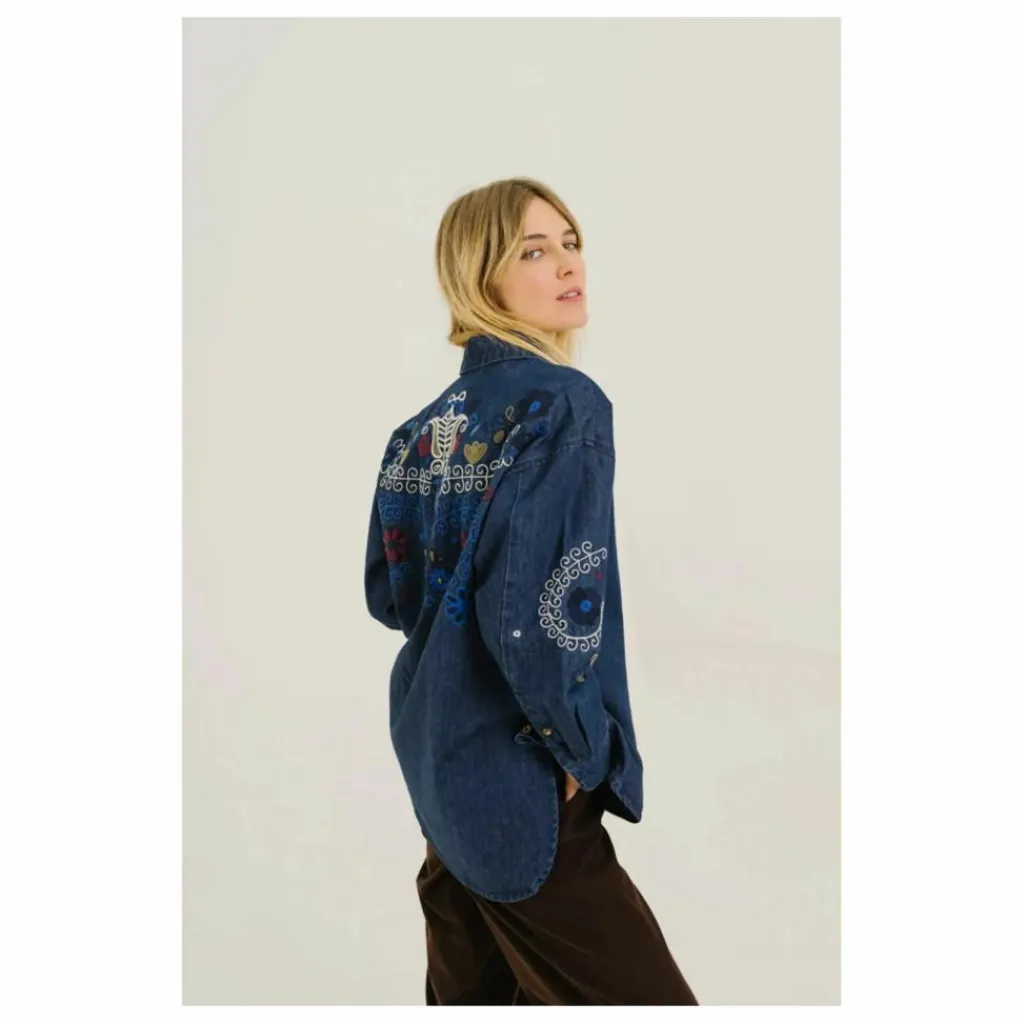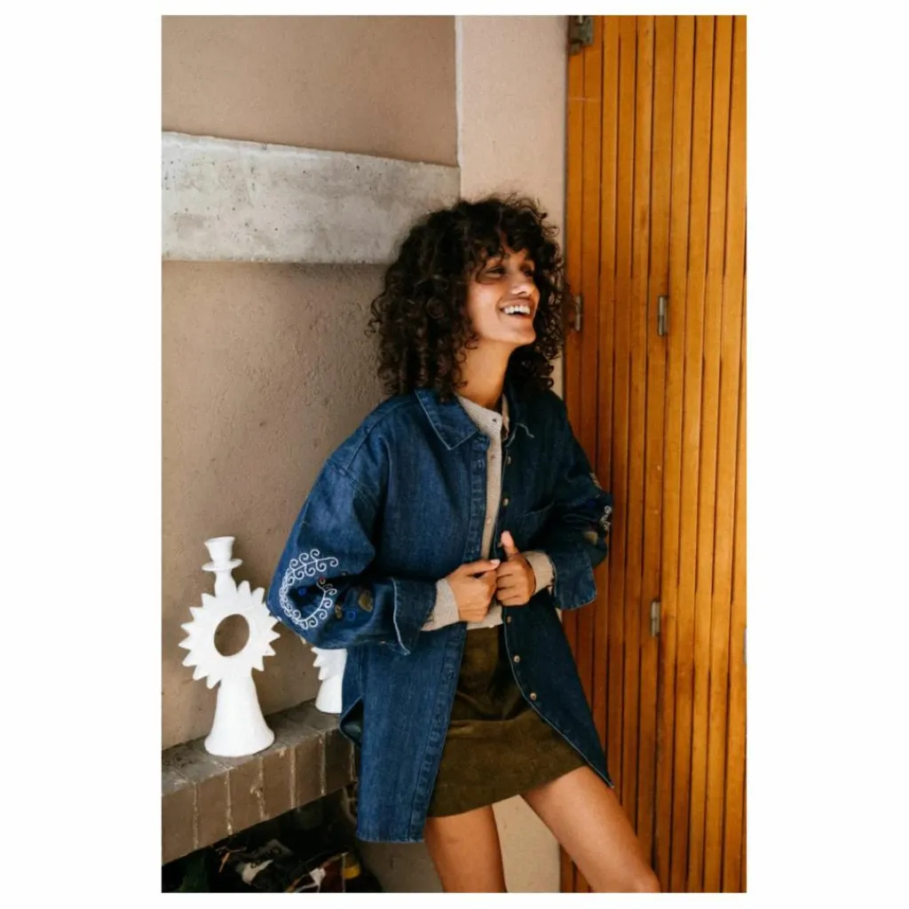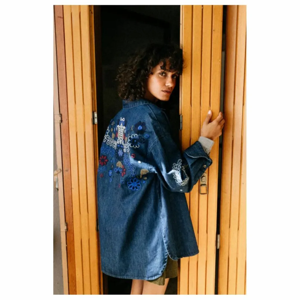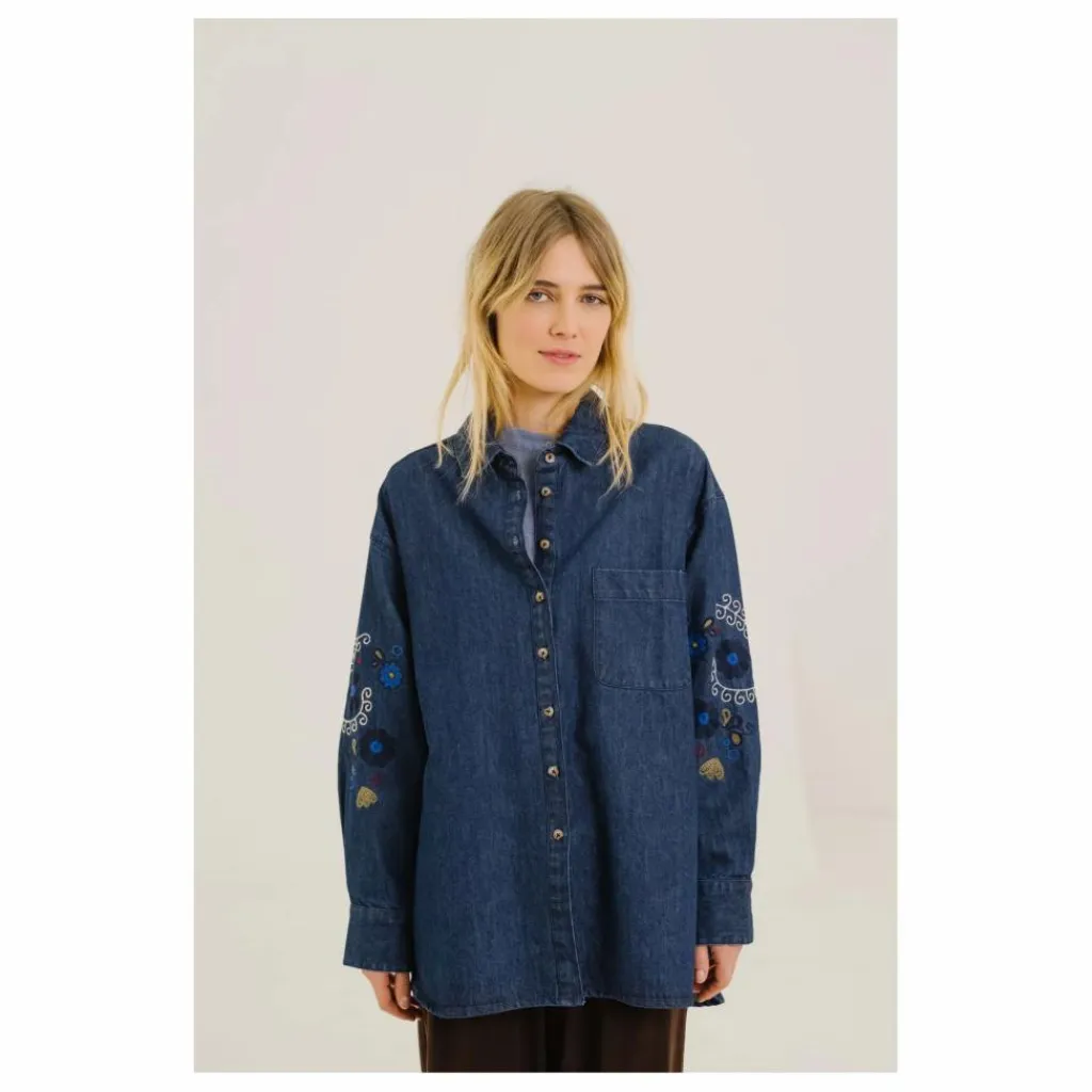 - Chemise longue en denim, esprit tunique, à la coupe décontractée et féminine. Confectionnée avec un col classique et une poche poitrine, elle se distingue par ses broderies placées au dos et sur les manches. Les fentes côtés et la longueur légèrement accentuée au dos apportent fluidité et modernité. Manches fermées par un bouton pour une finition soignée.