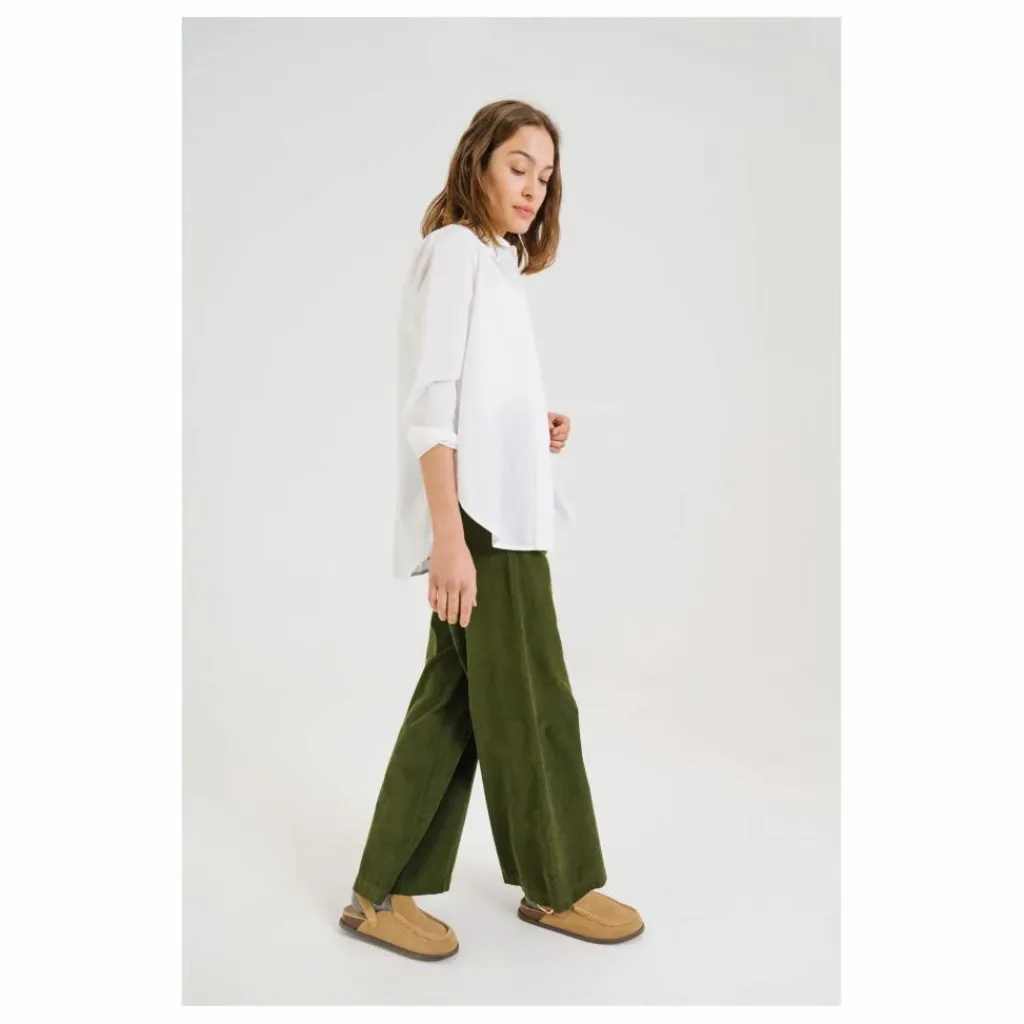 - Chemise à manches longues, confectionnée en coton blanc. Sa coupe ample est rehaussée par un col chemise classique et un boutonnage caché pour une allure épurée. Son empiècement au dos et son large pli ajoutent structure et fluidité. Poignets boutonnés et patte capucin en finition.