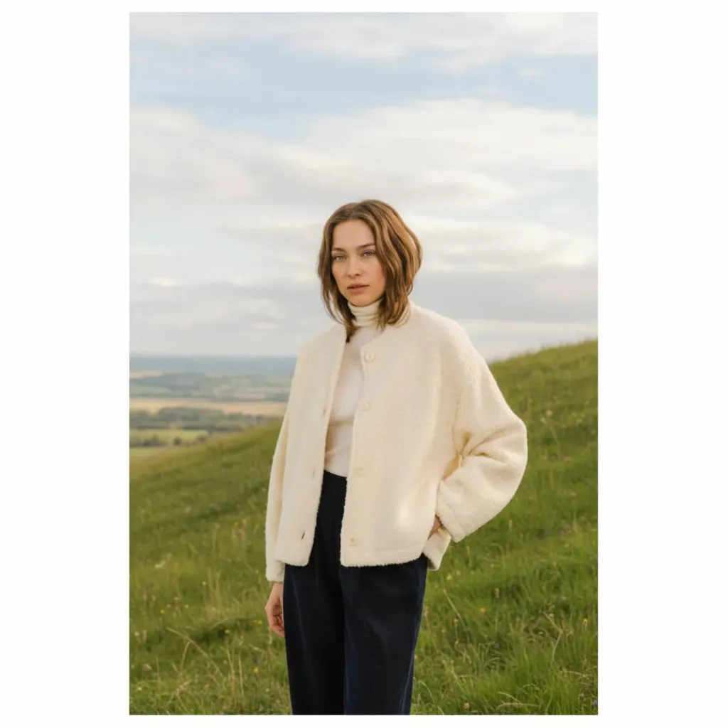 - Veste ronde en laine bouclette écru, entièrement doublée, dans un esprit bomber doux et structuré. Les manches sont resserrées par de larges plis pour une allure confortable et graphique. Dotée d’un col bomber, de boutons apparents et de poches dans la couture, elle allie texture chaleureuse et style contemporain.