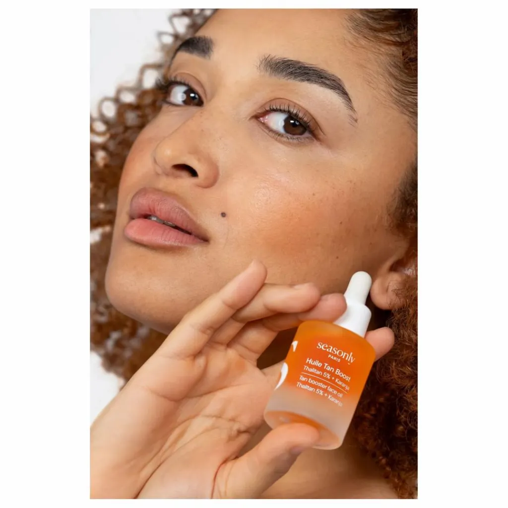 Une formule triple action, inspirée des compléments alimentaires les plus dosés du marché, pour préparer, activer et prolonger votre bronzage. L’objectif ? Mieux préparer votre peau et prévenir les effets néfastes des rayons UVs (notamment le vieillissement cutané) lors des expositions solaires tout en favorisant un bronzage plus rapide et uniforme, qui dure dans le temps. C’est l’allié idéal à la fois pour les peaux qui s’exposent, afin de booster les mécanismes de défense de la peau, mais aussi pour les peaux qui évitent le soleil et qui veulent un teint hâlé.Ce sérum-en-huile biphasé est composé de Thalitan et de Karanja, deux ingrédients phares pour booster la peau lors des expositions solaires. Le Karanja prépare la peau au soleil et prévient le vieillissement cutané lié aux effets néfastes des rayons UV. Le Thalitan, lui, stimule la synthèse de mélanine afin d’accélérer et de prolonger le bronzage. La formule est complétée par le Mélanobronze ainsi que des huiles riches en bêta-carotène afin d’apporter un bronzage régulier et naturel qui dure dans le temps.