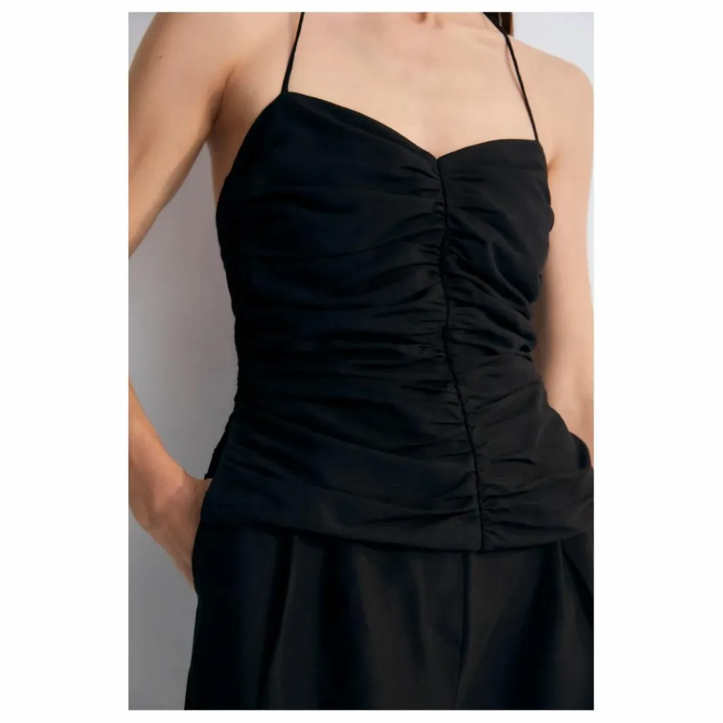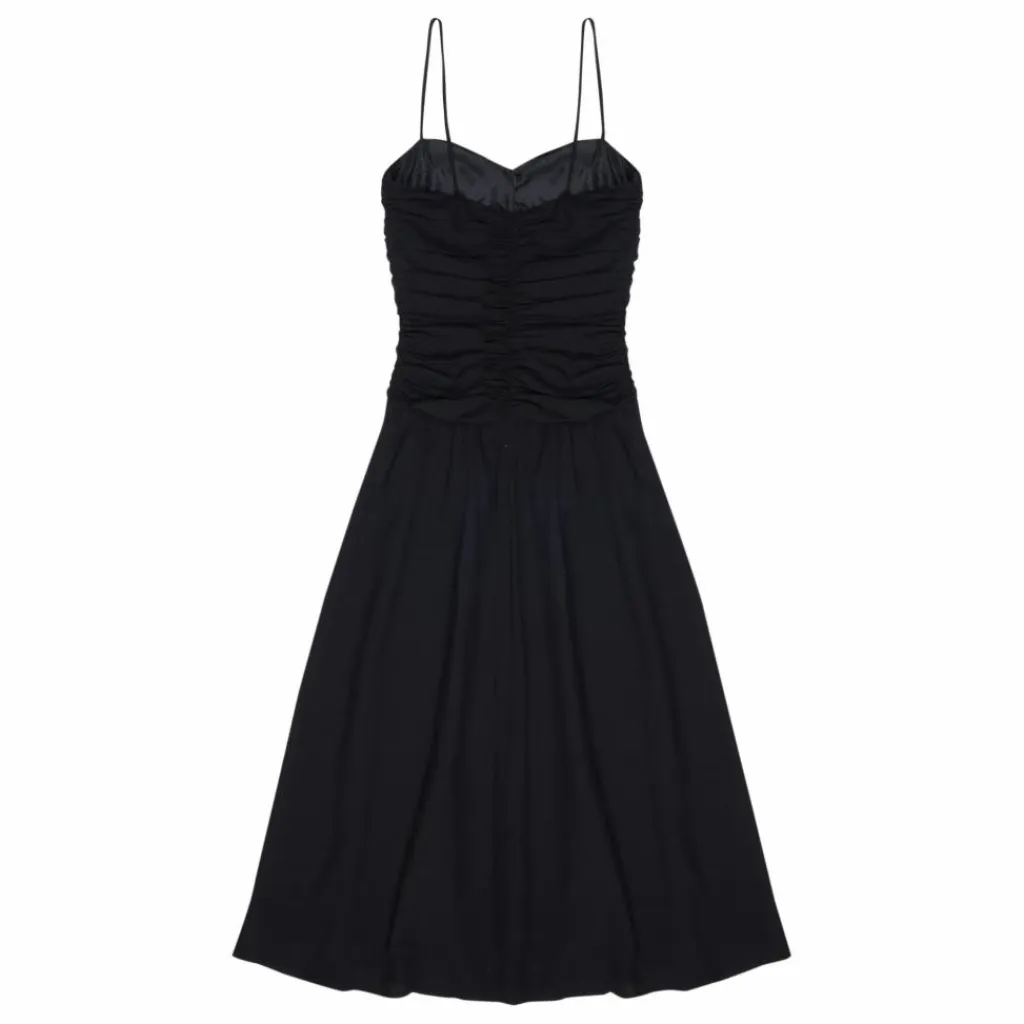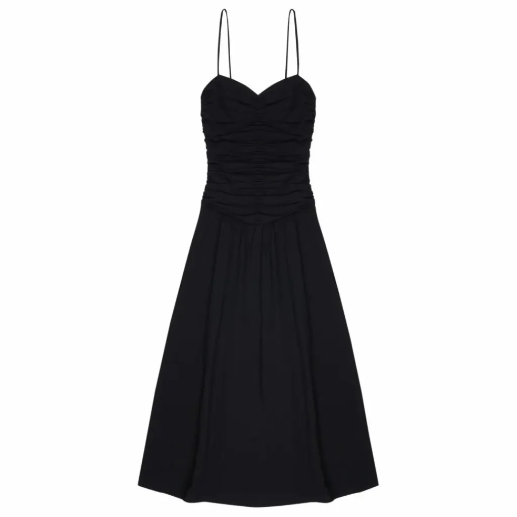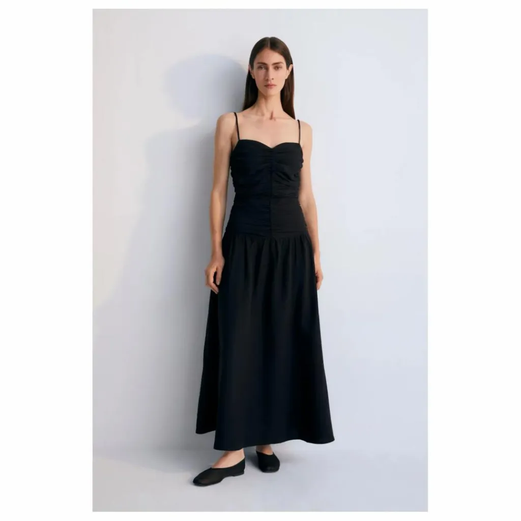 - Robe longue avec fronces sur le devant et le dos du corsage. Elle est munie de fines bretelles réglables et d’une fermeture éclair invisible sur le côté.