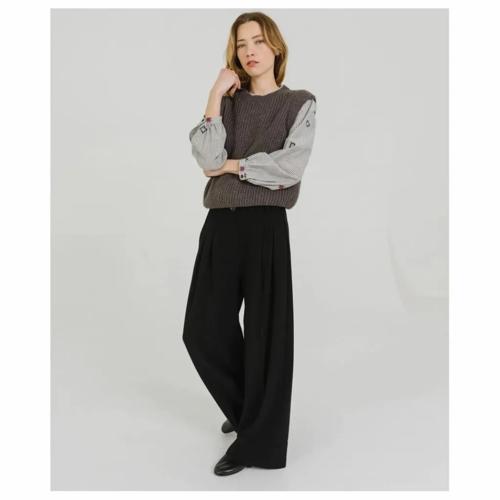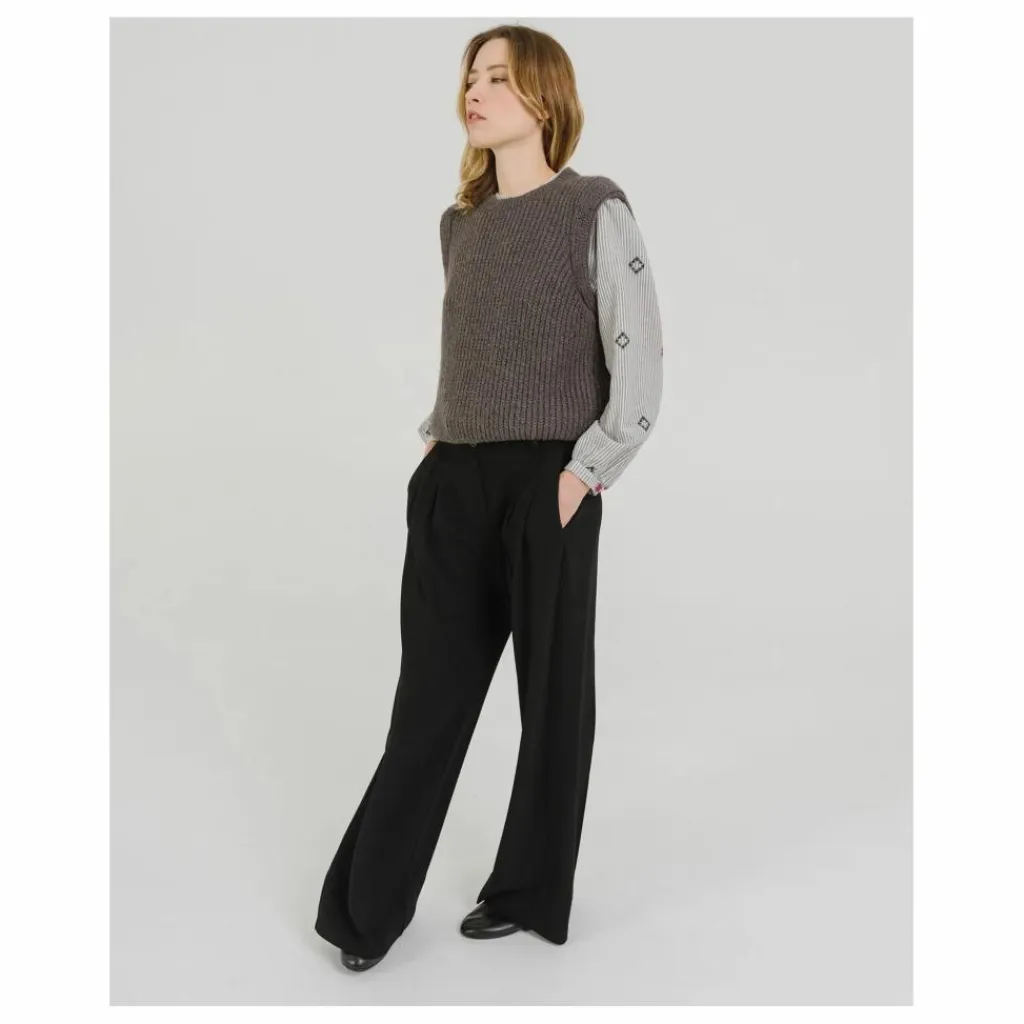 DJOAN est un pull sans manches à porter sur une chemise ou une robe. Un joli détail de tricotage aux emmanchures lui donne beaucoup de caractère. Parfait pour la mi saison et plus si affinité. Ce pull est tricoté dans un fil italien, en Italie. Maille ultra douce, résistante et chaude