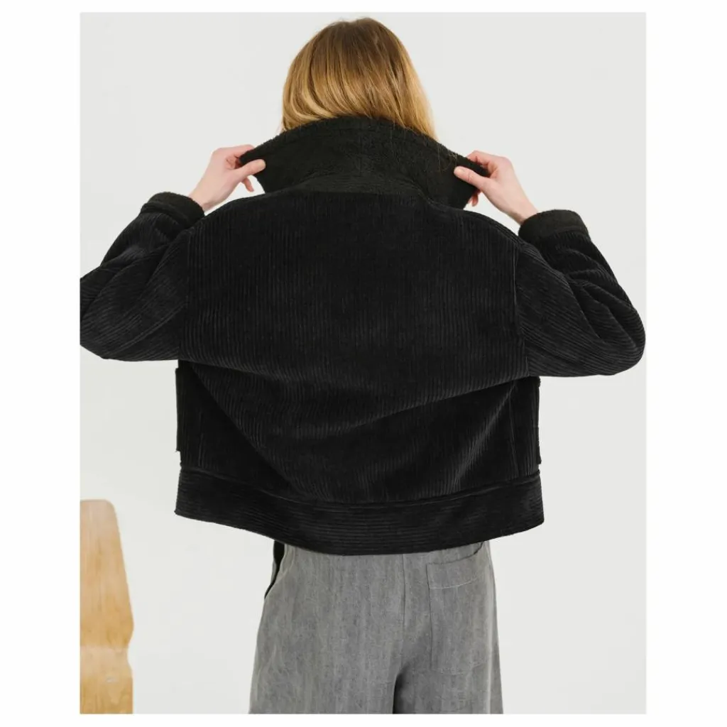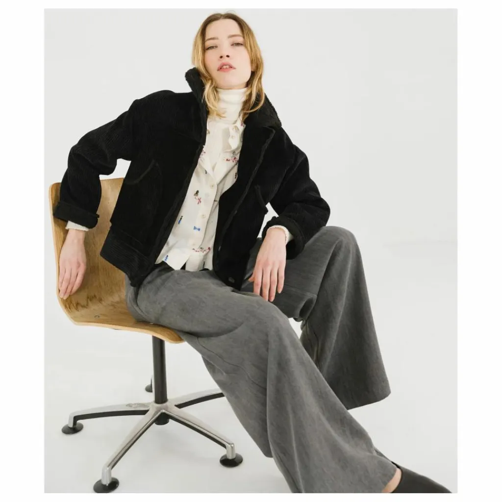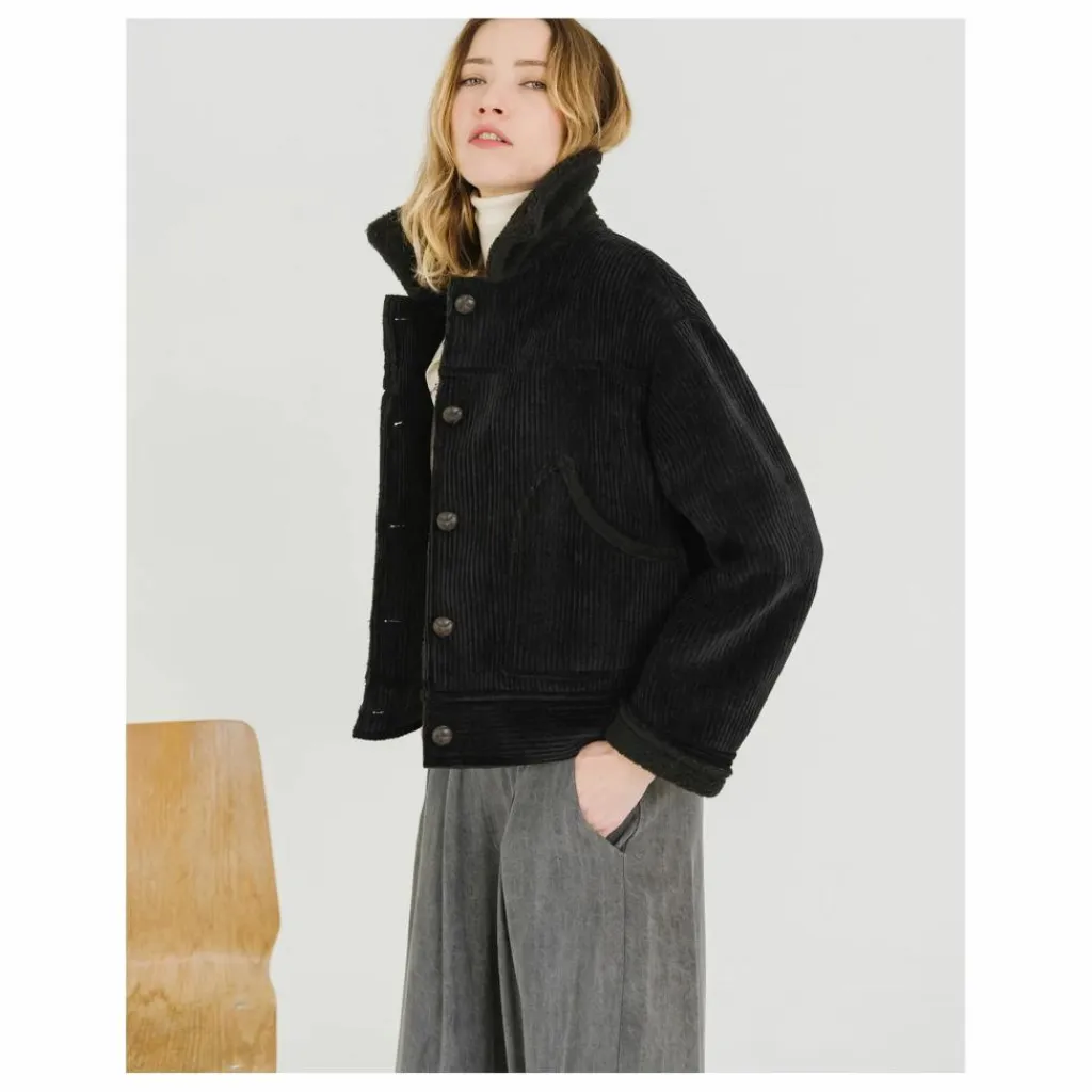 - DOUDOU est un blouson en velours effet mouton retourné, légèrement loose avec un large col, boutons effet cuir et poches plaquées sur le devant. Manches longues. DOUDOU est coupé dans un velours grosses côtes avec un contre collage effet mouton retournée, tissé en Italie.