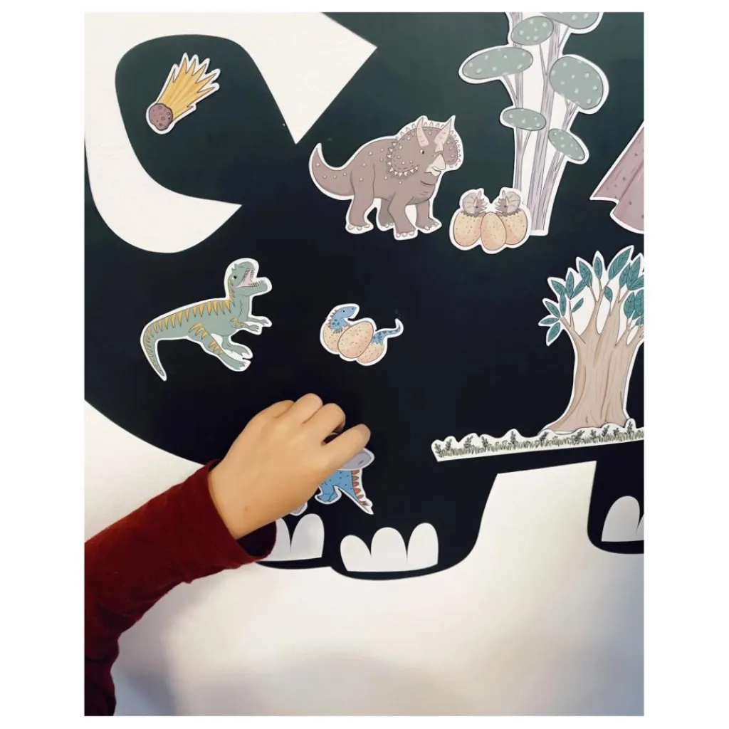 Jeu divertissant qui permet aux enfants de se familiariser avec ces impressionnantes créatures préhistoriques que sont les dinosaures et de développer leur imagination en donnant vie aux illustrations sur tous supports métalliques (frigo, tableau magnétique…),grâce aux 52 aimants à déplacer à l’infini.