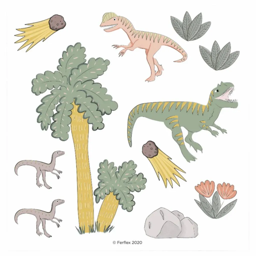 des dinosaures réalistes : Diplodocus, Dilophosaure, Ceratosaure, Stégosaure, Brontosaure, Archéoptéryx, ptérodactyle, compsognathus et triceratops.