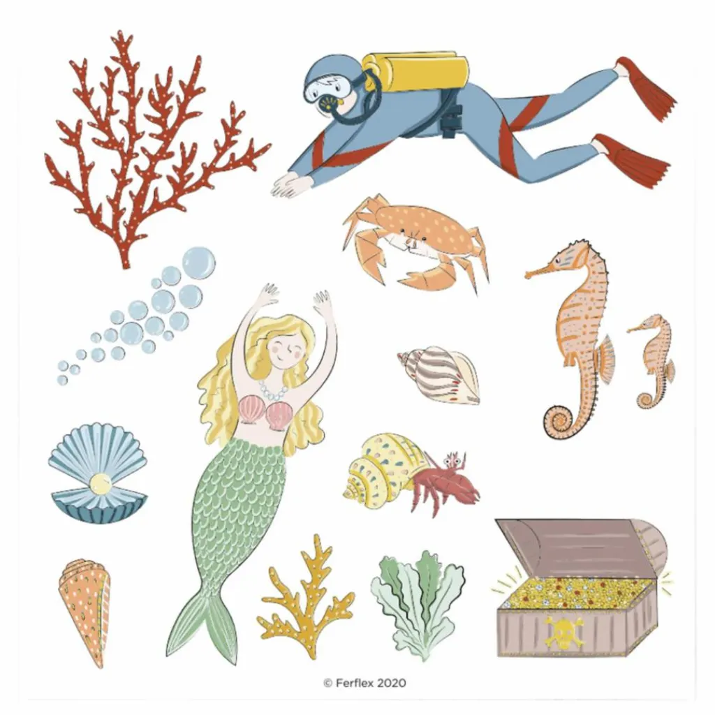 Lancez des discussions entre animaux aquatiques et plongeurs et jouez de petites scénettes. De nombreuses possibilités de jeux avec le lot de 52 magnets sur le thème des fonds marin. Formes aimantées à déplacer à l’infini sur tous supports métalliques : sur un frigo ou sur un tableau magnétique.