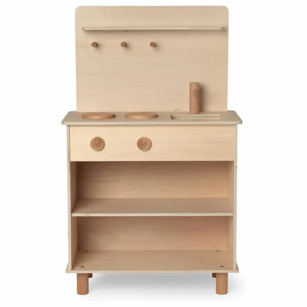 - Cette petite cuisine ludique n’a jamais trop de cuisiniers. Entraînez-vous à préparer vos plats préférés ou inventez de nouvelles recettes fantaisistes. Fabriquée en contreplaqué naturel, elle laisse place à l’imagination des enfants tout en étant un choix contemporain et élégant qui peut être placé n’importe où dans la maison. La cuisine est équipée d’un évier avec robinet, de deux plaques de cuisson, de trois crochets pour tous les ustensiles et d’étagères de rangement. Les détails sont réalisés en bois de hêtre massif naturel et légèrement teinté, ce qui leur permet de se démarquer.