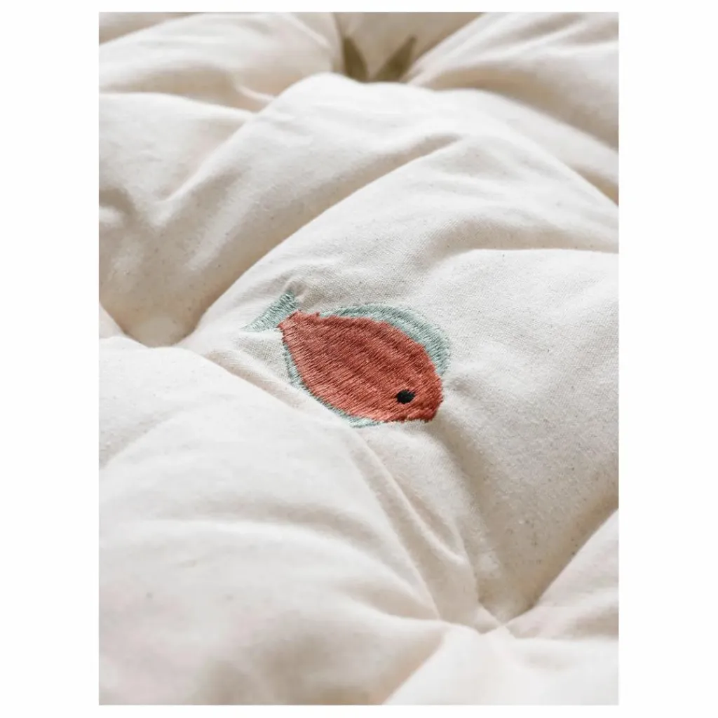 - Tissu : 100 % coton biologique avec broderie. Rembourrage : 100% polyester recyclé
