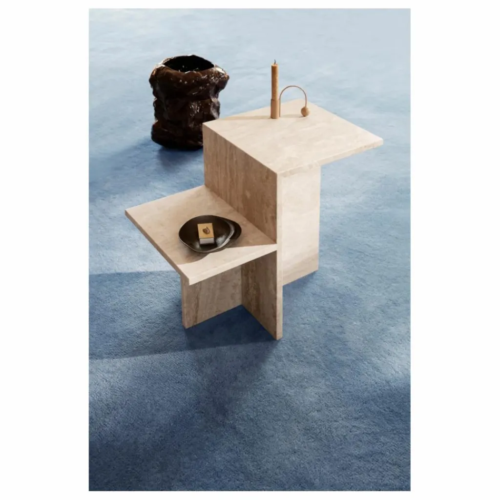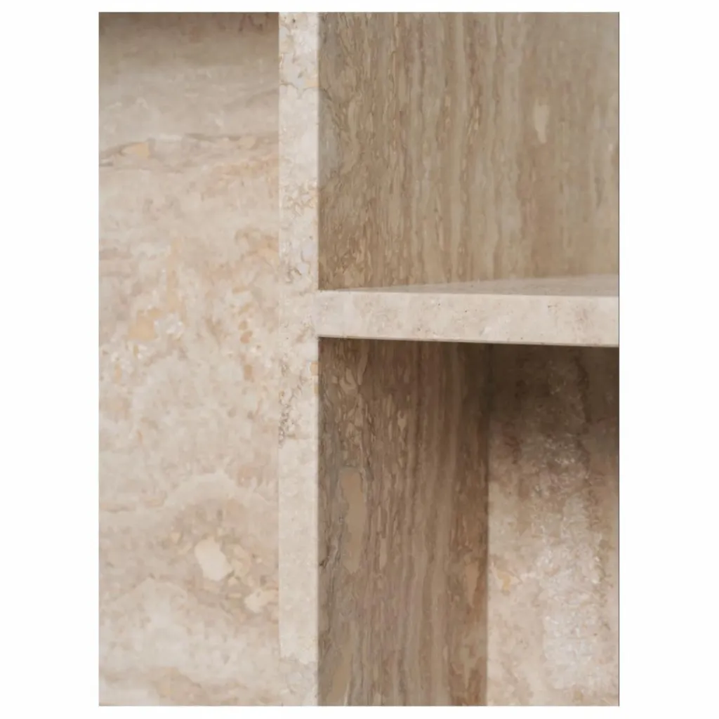 Cette table très tendance s’inspire du design japonais et se construit tel un dessin de lignes complexes basées sur un seul élément. Le travertin à la couleur minérale lui confère un aspect brut qui met en valeur ses lignes.
