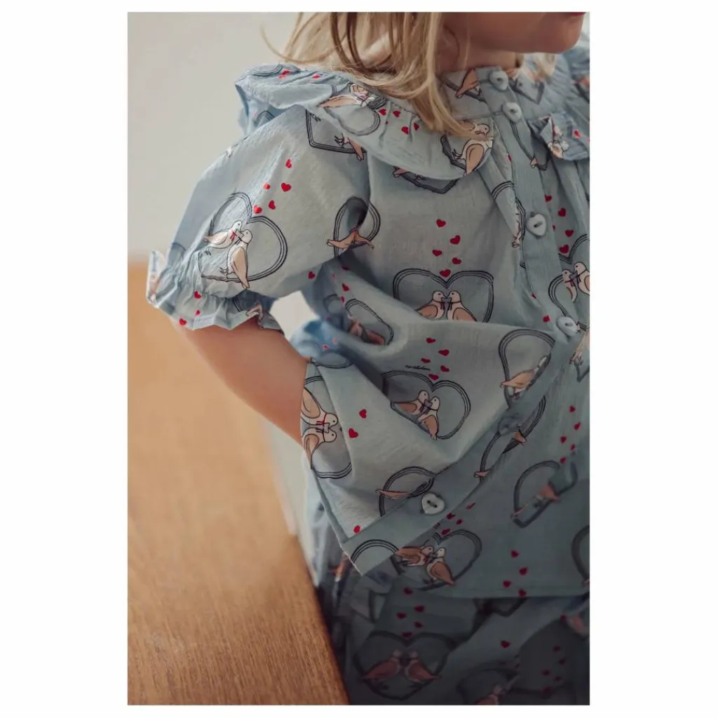 Le nom Colombe est français et signifie colombe, car l’imprimé se compose de deux colombes assises dans un cœur. Le chemisier est parfaitement assorti à notre pantalon COLOMBE, qui présente le même imprimé et la même qualité de douceur.