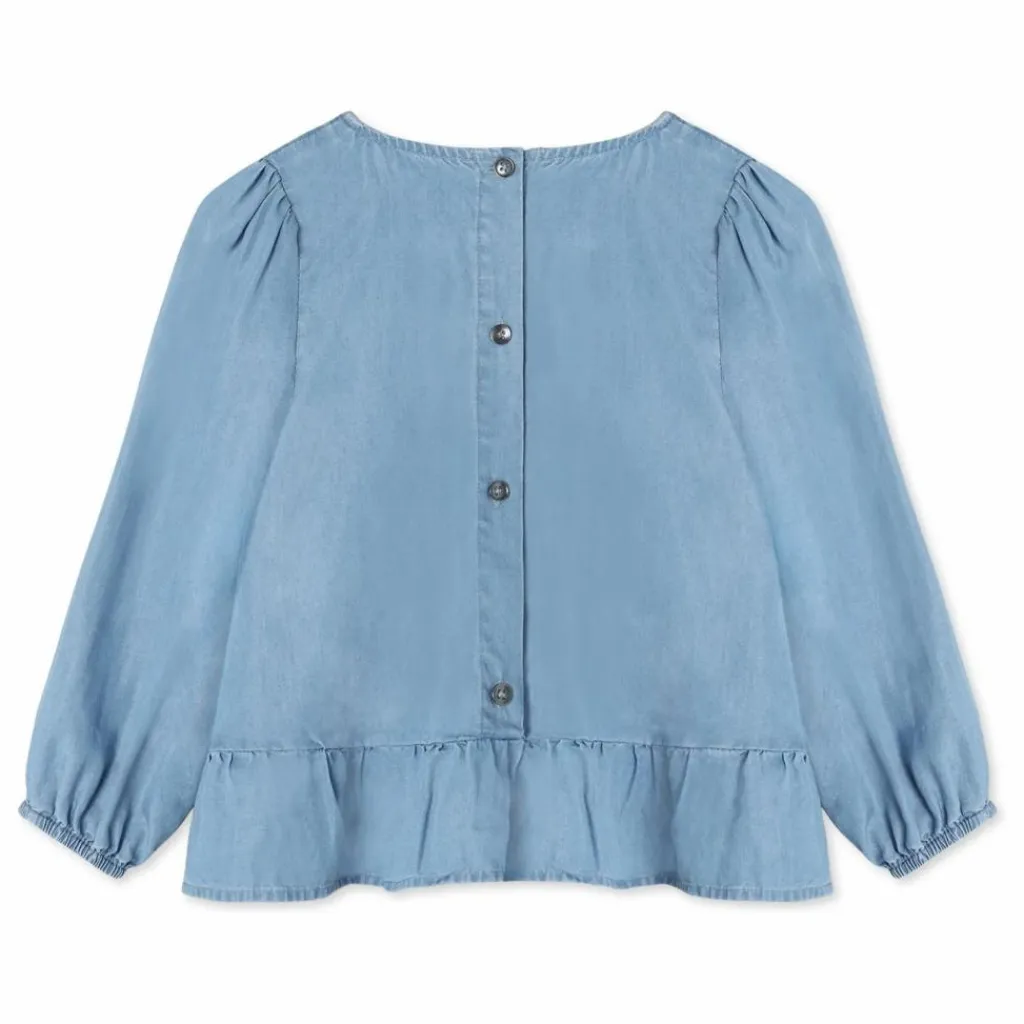 - Chemisier doux à manches longues avec des volants sur le devant et les manches se terminent par un élastique qui apporte un détail mignon. La blouse est boutonnée dans le dos.