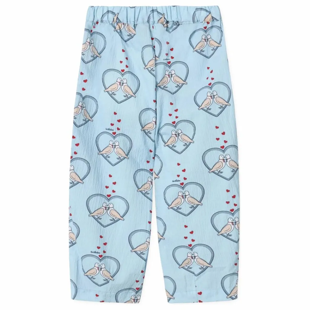 - Pantalon en qualité imprimée douce et texturée. Le pantalon a un élastique à la taille et des poches latérales avec un joli volant. Le pantalon descend jusqu’aux chevilles et a une coupe ample qui le rend agréable à porter. Le nom Colombe est français et signifie colombe, car l’imprimé se compose de deux colombes assises dans un cœur.