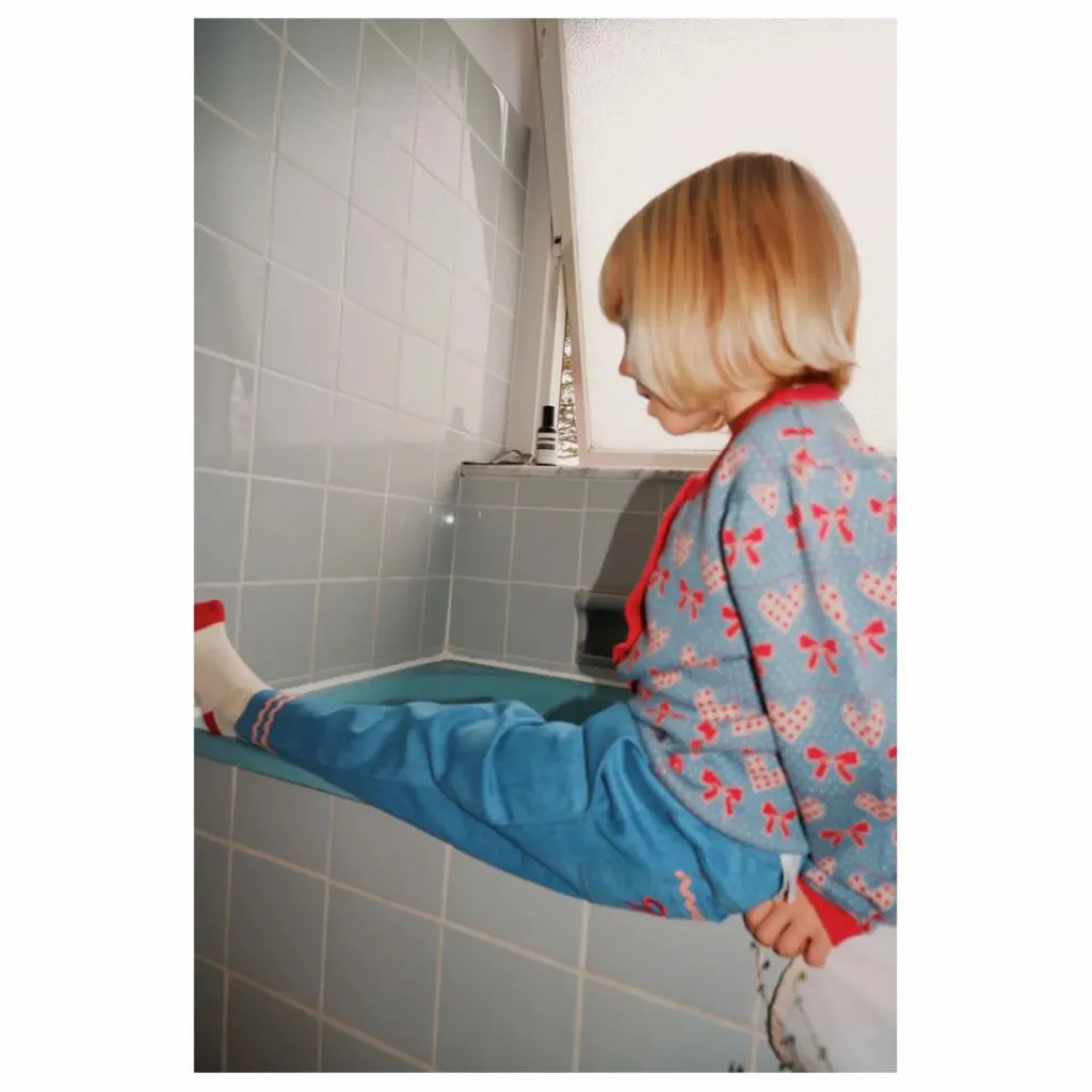 Il est doté d’une ceinture élastique et de poches sur le côté et à l’arrière. Le pantalon présente également des détails contrastés roses à l’ourlet.