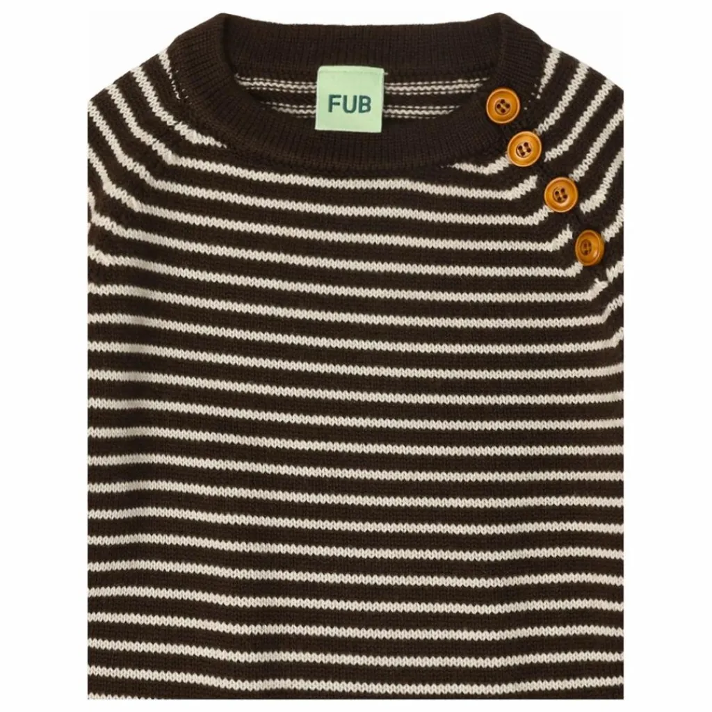 - Tricoté dans un jersey simple et propre, ce pull à manches longues est un classique de FUB. Il présente une coupe droite et ample, des manches raglan et des ourlets propres et repliés. Le pull a une encolure ronde côtelée, une fermeture boutonnée à l’épaule avec des boutons en bois et des boucles de boutons faites à la main. Conçu avec une forme spacieuse, il est parfait pour être superposé ou porté seul. Le pull est tricoté dans une rayure classique teintée en fil et fabriqué en pure laine mérinos. La laine mérinos est certifiée BLUESIGN® et RWS, sans produits chimiques nocifs, et provient de moutons non mulets.