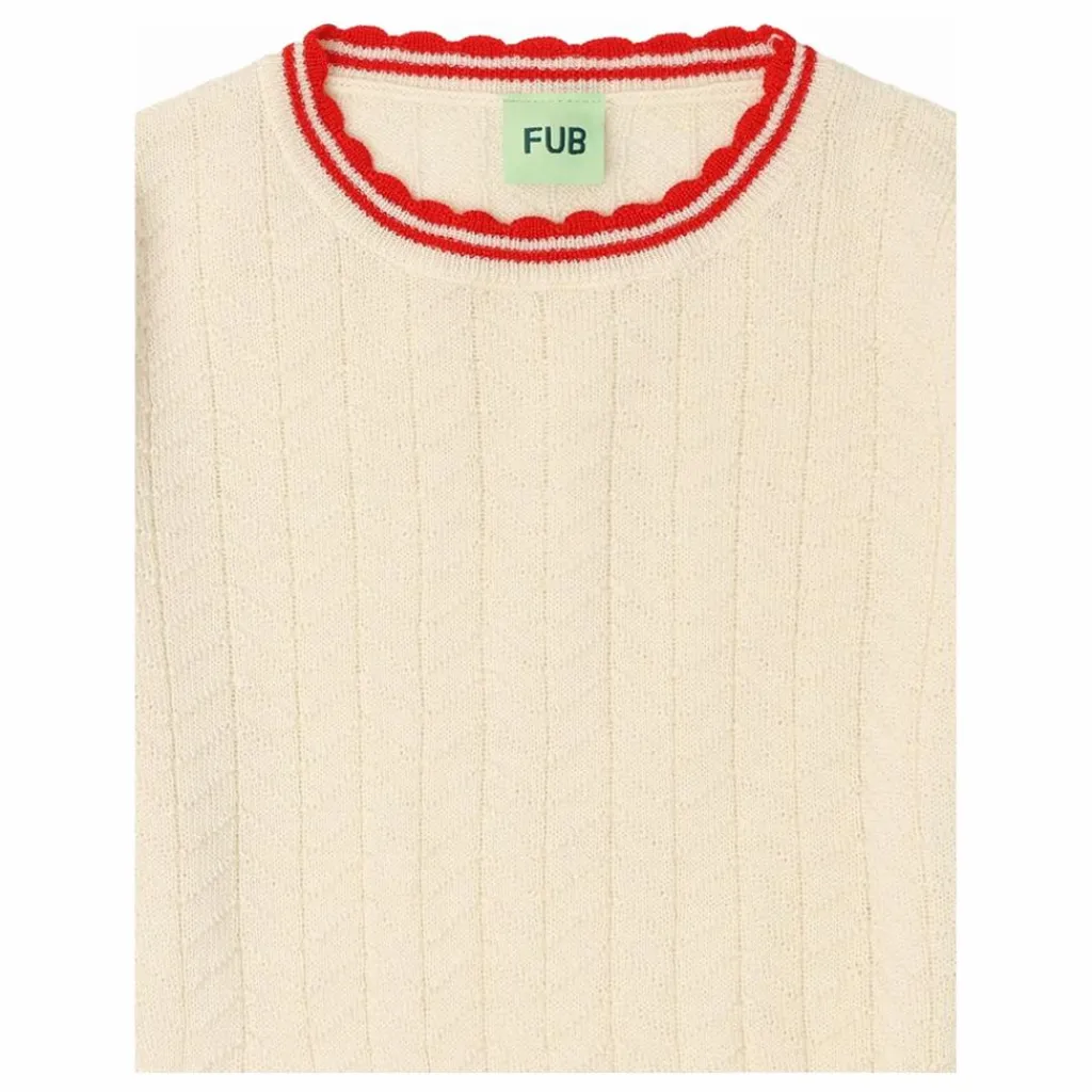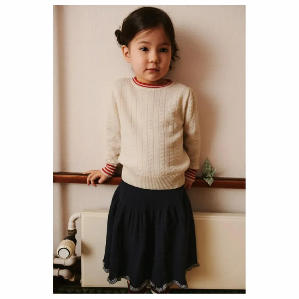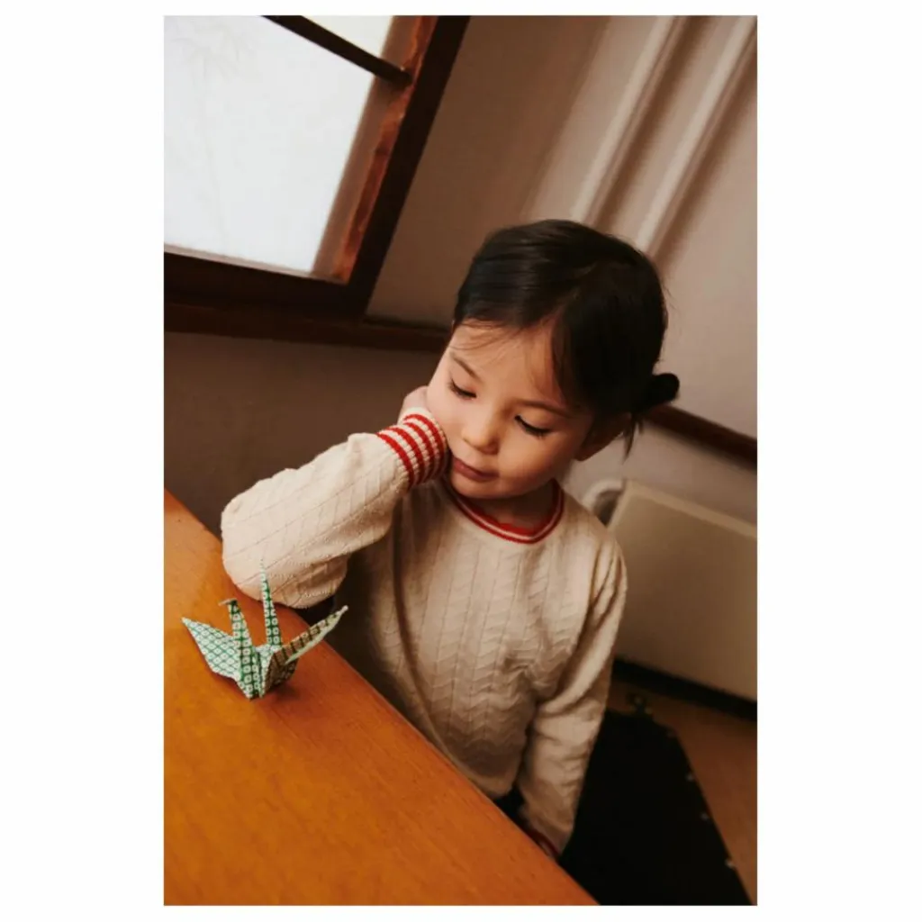 - Ce pull est tricoté en laine mérinos extra-fine avec un motif en zigzag et présente une coupe régulière. Il présente une encolure côtelé avec un petit bord en dentelle, des rayures de couleur contrastée à l’encolure et aux poignets, et des manches longues avec de petites fronces en haut. Le pull présente également des détails côtelés à l’extrémité des manches et à l’ourlet. La laine mérinos est certifiée BLUESIGN® et RWS, elle est exempte de produits chimiques nocifs et provient de moutons non mulets.