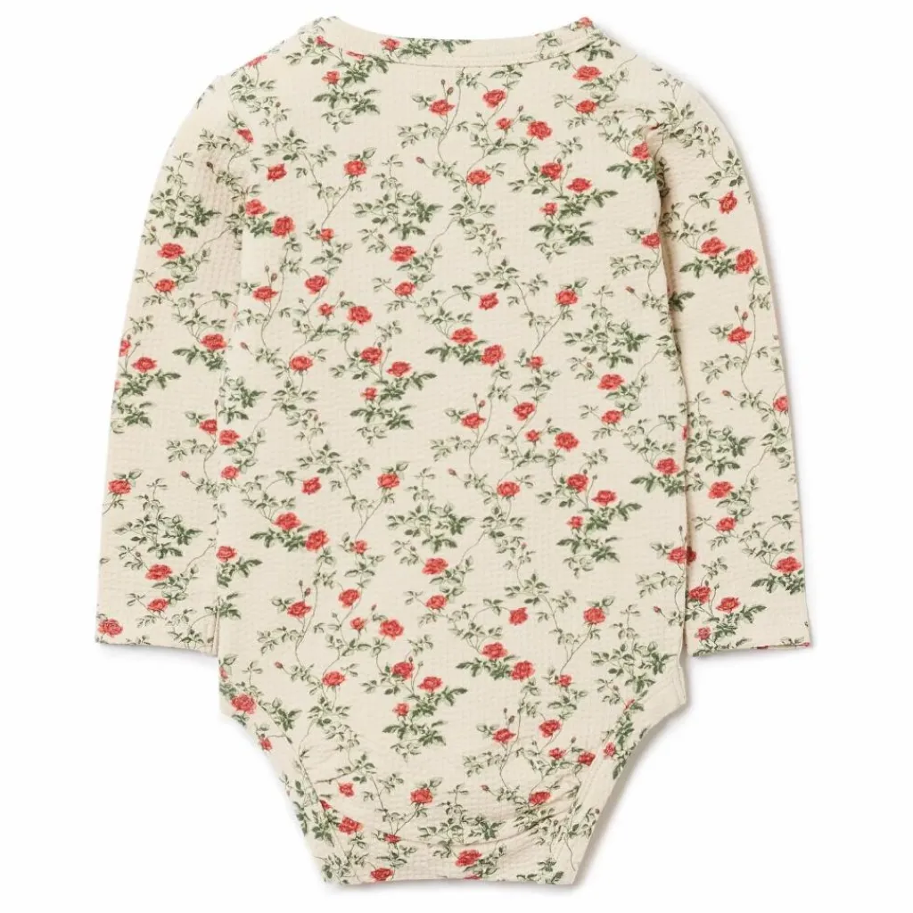 - Corps en jersey doux et structuré en coton biologique légèrement extensible pour un confort tout au long de la journée. Le body a des manches longues et des boutons-pression à l’entrejambe pour faciliter l’habillage et le changement de couche.