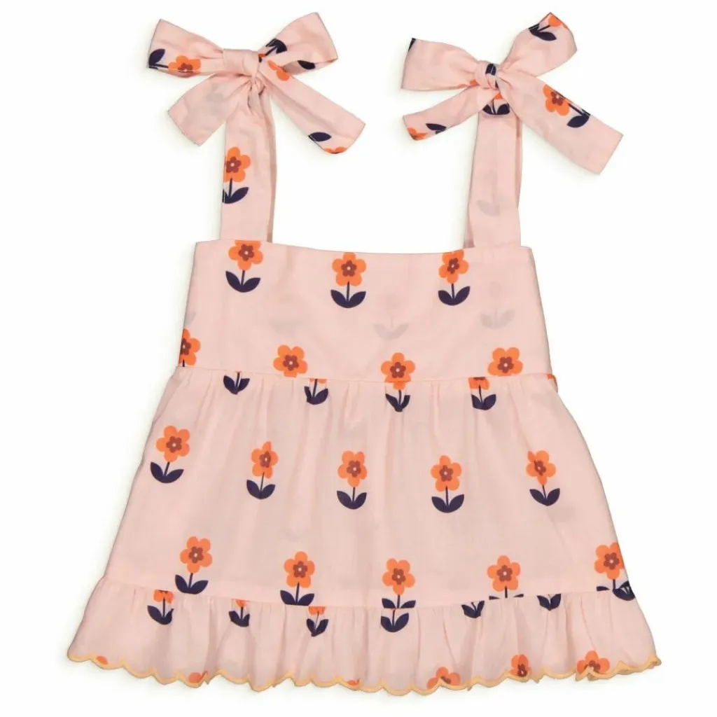 - Chemisier à bretelles en voile imprimé dans tous les sens, avec nœuds sur les bretelles et smocks élastiques au dos. Bas avec volant festonné.