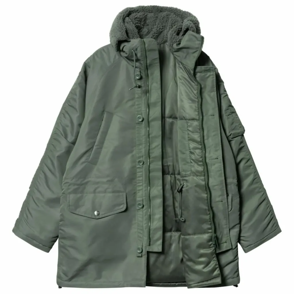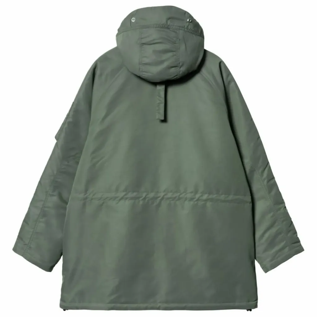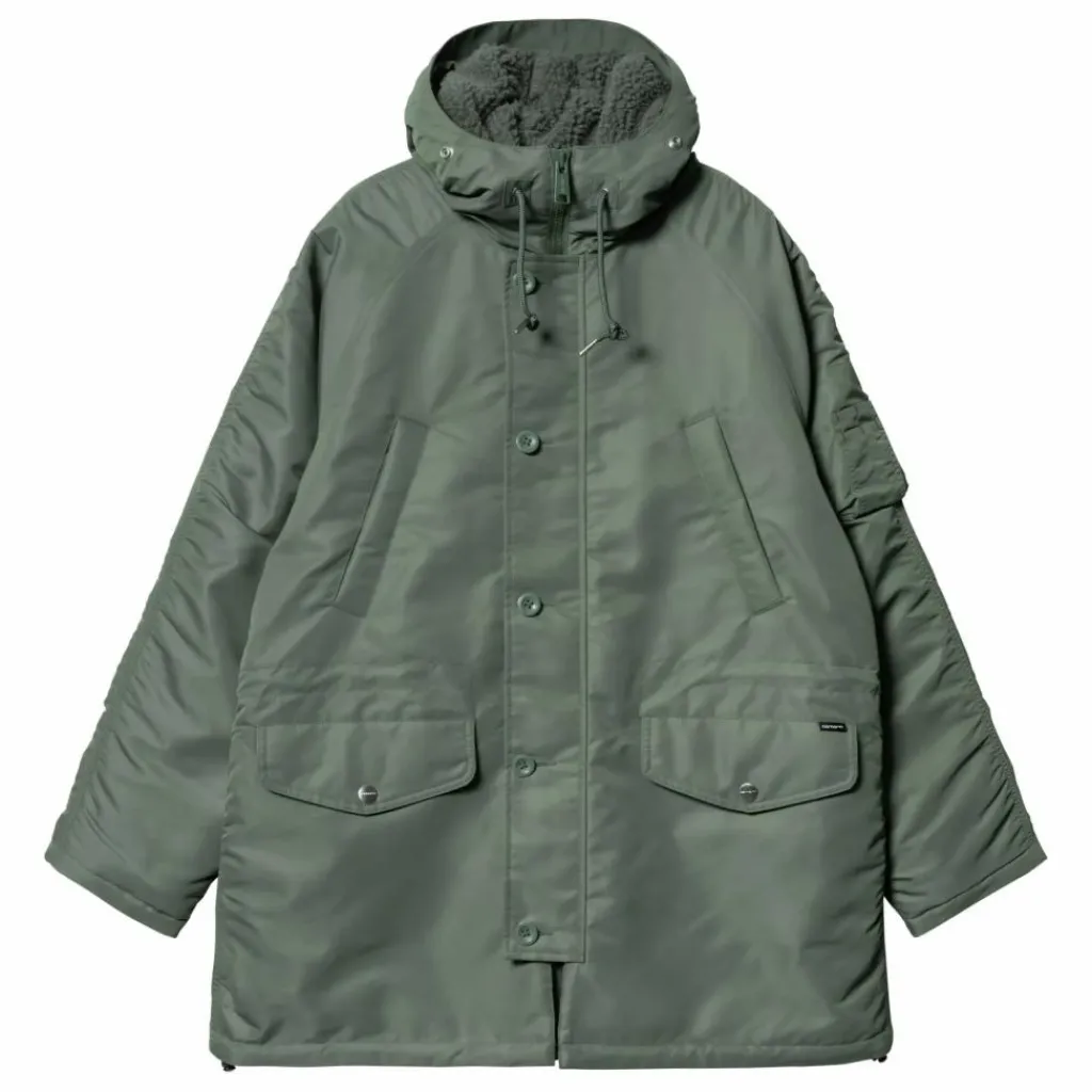 - La parka à capuche ‘Olten’ est confectionnée en nylon sergé léger. Déperlante, elle est doublée en taffetas de nylon. Ce modèle dispose d’une capuche ajustable doublée en polaire et d’une bordure détachable en polaire au niveau de la taille et de la base. Deux poches passepoilées au niveau de la poitrine, deux poches à rabat boutonné sur la moitié inférieure de la parka, une poche zippée sur la manche gauche et le Flag Label complètent le design.