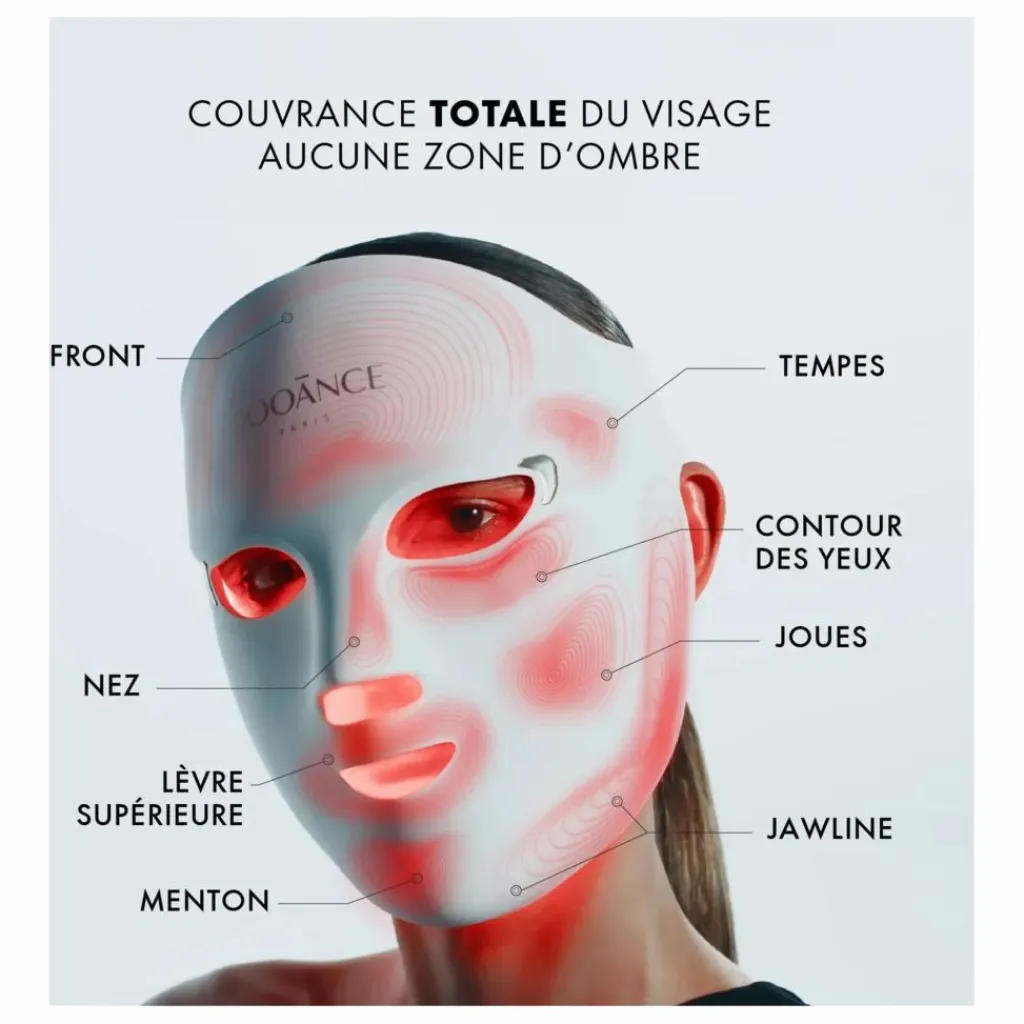 - Le Masque Élite X600 s’adapte parfaitement aux contours du visage, offrant une stimulation uniforme de toutes les zones cutanées, y compris les plus difficiles à atteindre : menton, ailes du nez, lèvre supérieure et intégralité de la mâchoire jusqu’aux oreilles. Son design 3D en silicone médical ultra‑souple permet de traiter chaque courbe avec une précision inégalée, là où aucun autre masque LED ne peut agir.Une couverture lumineuse totaleGrâce à sa conception anatomique et à un maillage LED ultra-dense, toutes les zones du visage — du haut du front aux tempes, des ailes du nez à la jawline et au cou — sont ciblées avec une précision maximale, sans dispersion d’énergie.Une efficacité professionnelle à domicileChaque LED est orientée de manière à émettre la lumière perpendiculairement à la peau, minimisant les pertes par réflexion et diffusion. Cet angle d’incidence optimisé assure une pénétration directe dans l’épiderme, garantissant une absorption maximale de l’énergie là où elle est réellement utile.