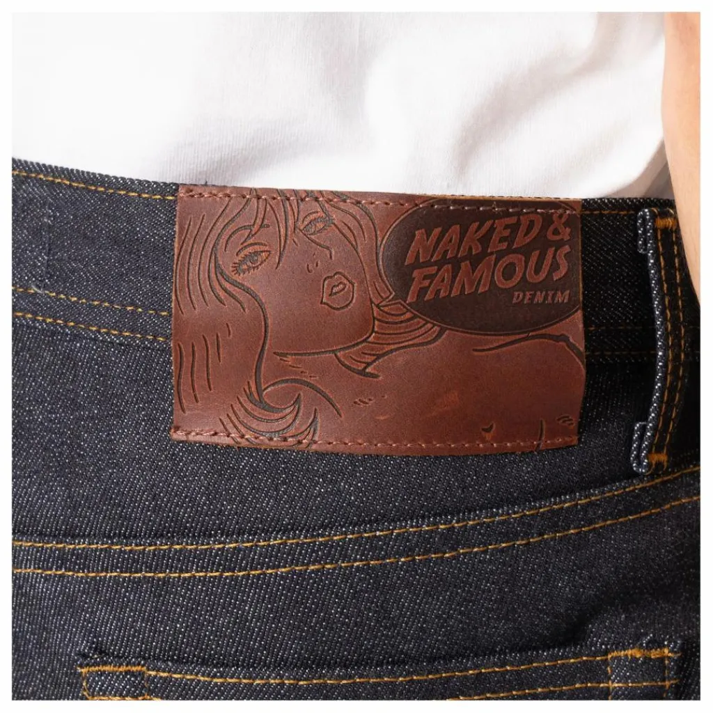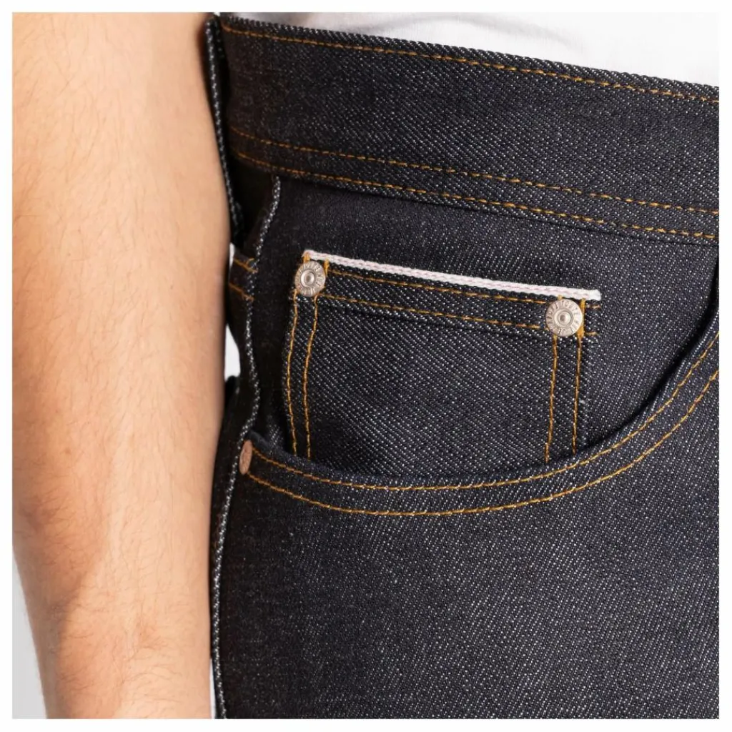 - Le Weird Guy a une coupe fuselée régulière, une taille moyenne, une cuisse standard et un léger amincissement du genou à l’ourlet. Le Gateway Selvedge est un denim selvedge japonais de 14,3 oz qui allie tradition et confort, avec 2 % d’élasticité pour une expérience de denim brut plus accessible. Tissé avec du coton à fibres courtes dans la chaîne, ce tissu présente une surface granuleuse et texturée qui incarne le caractère robuste du denim brut classique. Mais avec 2 % d’élasthanne dans la trame, il offre de la souplesse et élimine la période de rodage typique, ce qui en fait le point d’entrée parfait pour ceux qui découvrent le denim brut. Vous obtenez l’aspect et le toucher d’un denim rigide, avec le confort supplémentaire d’une élasticité qui dure toute la journée. Les détails clés comprennent des coutures contrastées, un patch en cuir Raging Bull personnalisé, une identification en lisière rose, une poche à monnaie en lisière exposée, ainsi que des boutons et des rivets métalliques argentés. Le