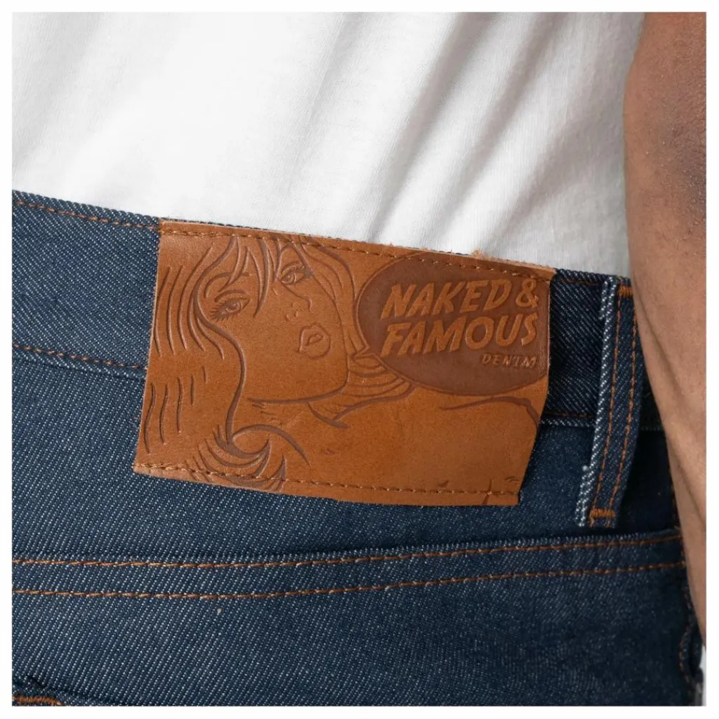 - Le Super Guy a une coupe étroite et fuselée, une taille moyenne, une cuisse étroite et une coupe fuselée du genou à l’ourlet. Fabriqué à partir d’un denim japonais de 12,5 oz teint à la corde, tissé sur des métiers à tisser à navette d’époque en sergé main droite. La chaîne teinte à l’indigo et la trame blanche, combinées à une ligne de lisière bleue, confèrent à ce jean un aspect classique. La teinture indigo naturelle, dérivée de la fermentation de la plante indigofera, est utilisée pour créer le ton bleu moyen de ce jean.