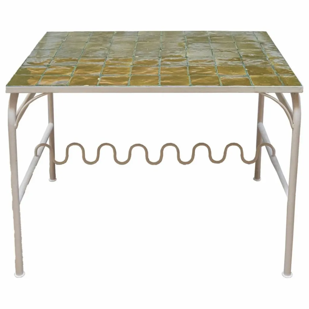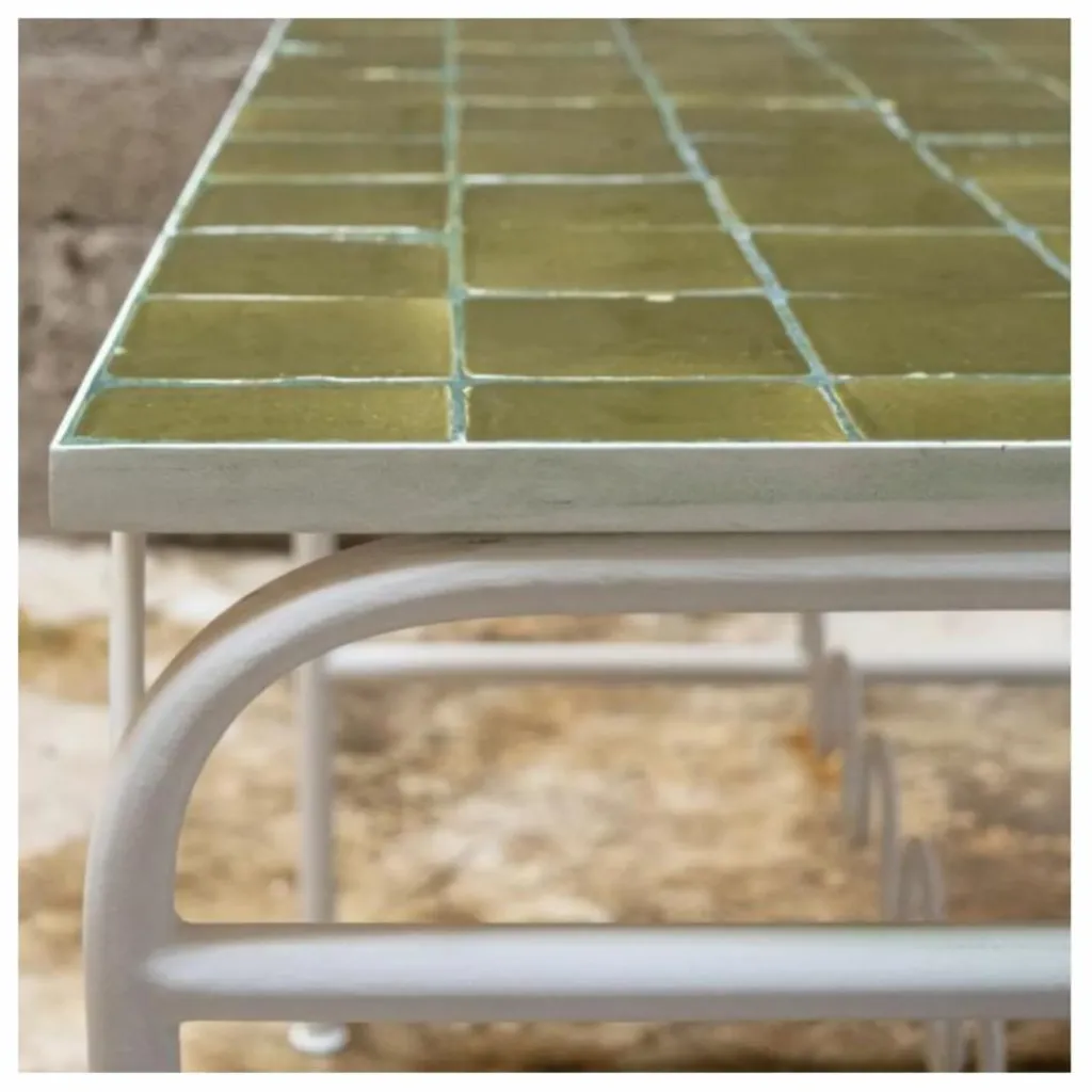 - Structure en fer recouverte d’une peinture époxy Ecru, Plateau en briquettes de terre cuite traitées Kaki