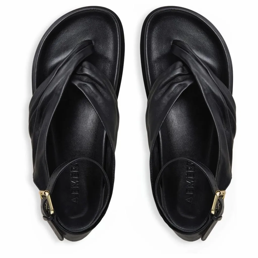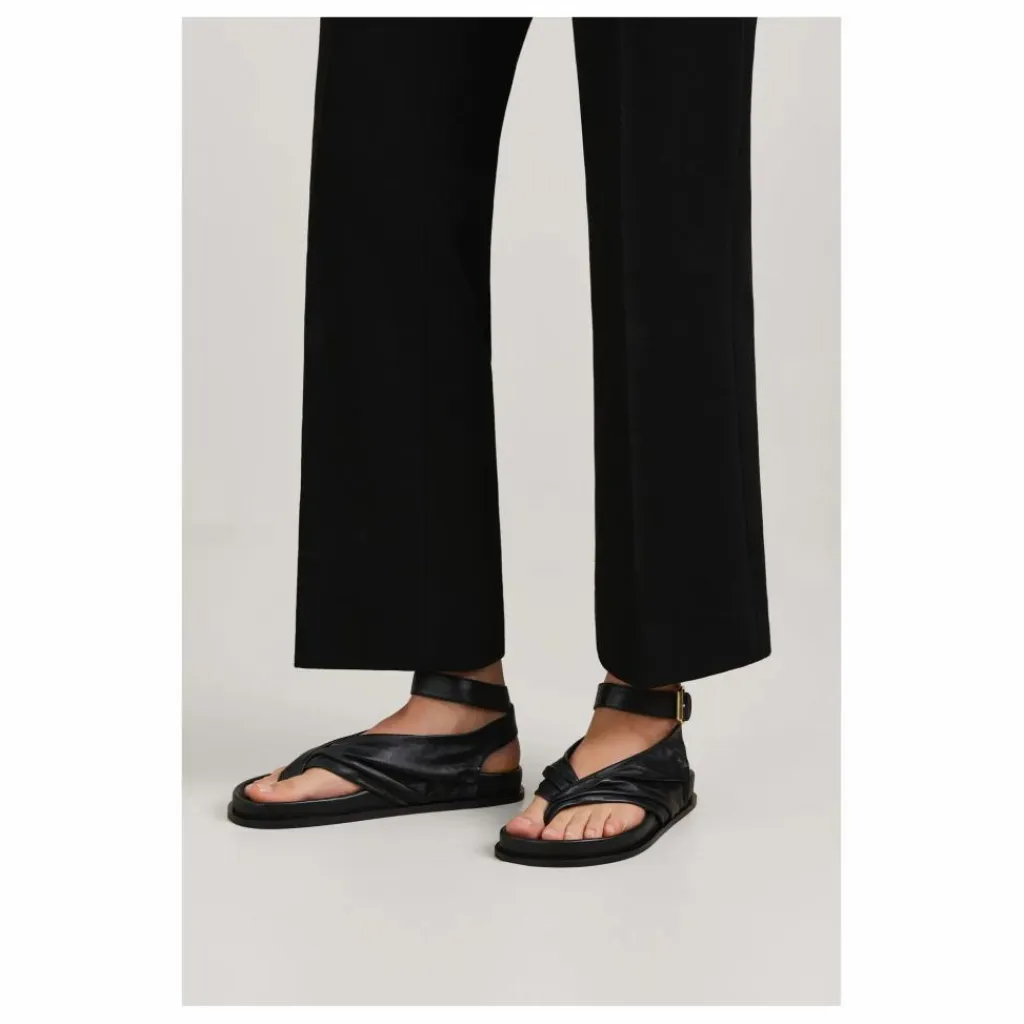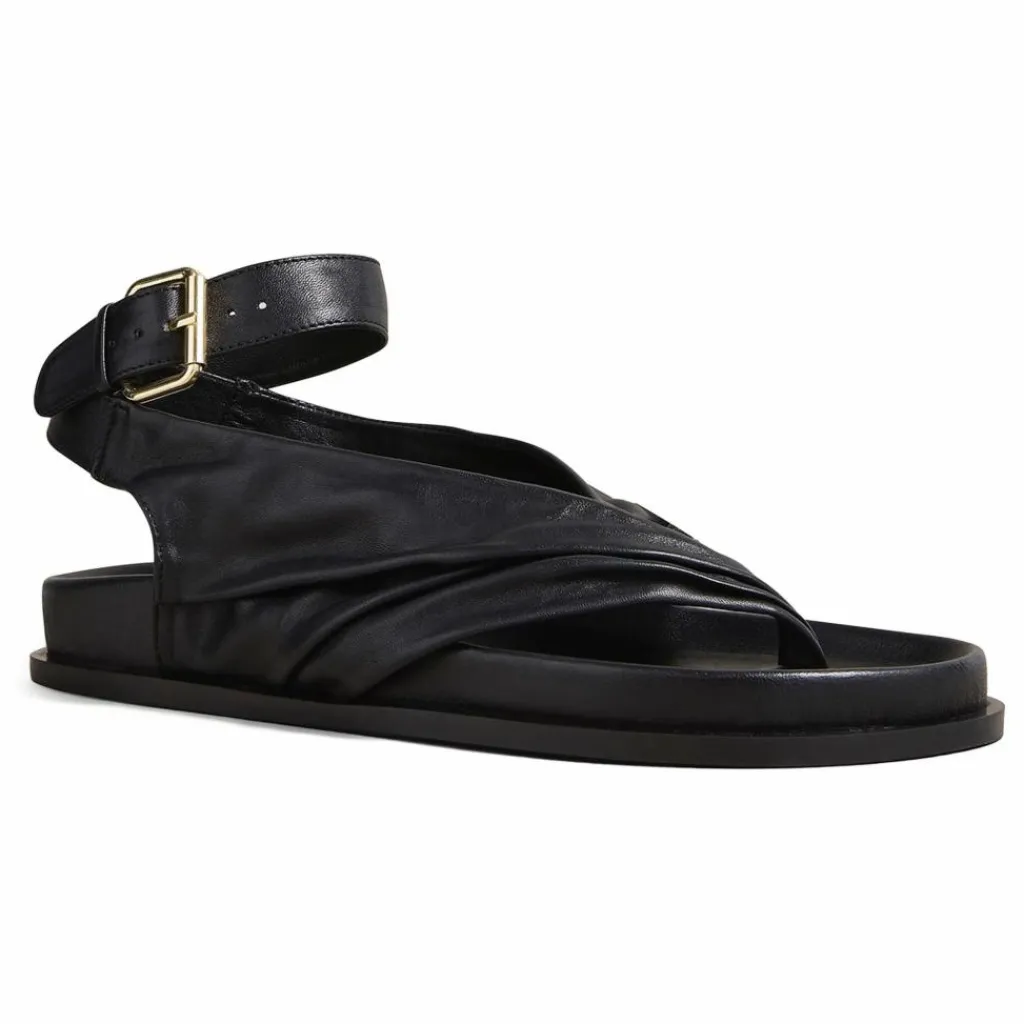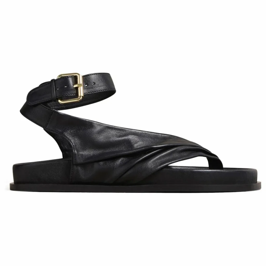 - La sandale Mantei repose sur une assise plantaire moulée avec deux généreuses brides froncées qui partent d’un point central et s’enroulent autour de la cheville, sécurisées par une boucle dorée audacieuse.