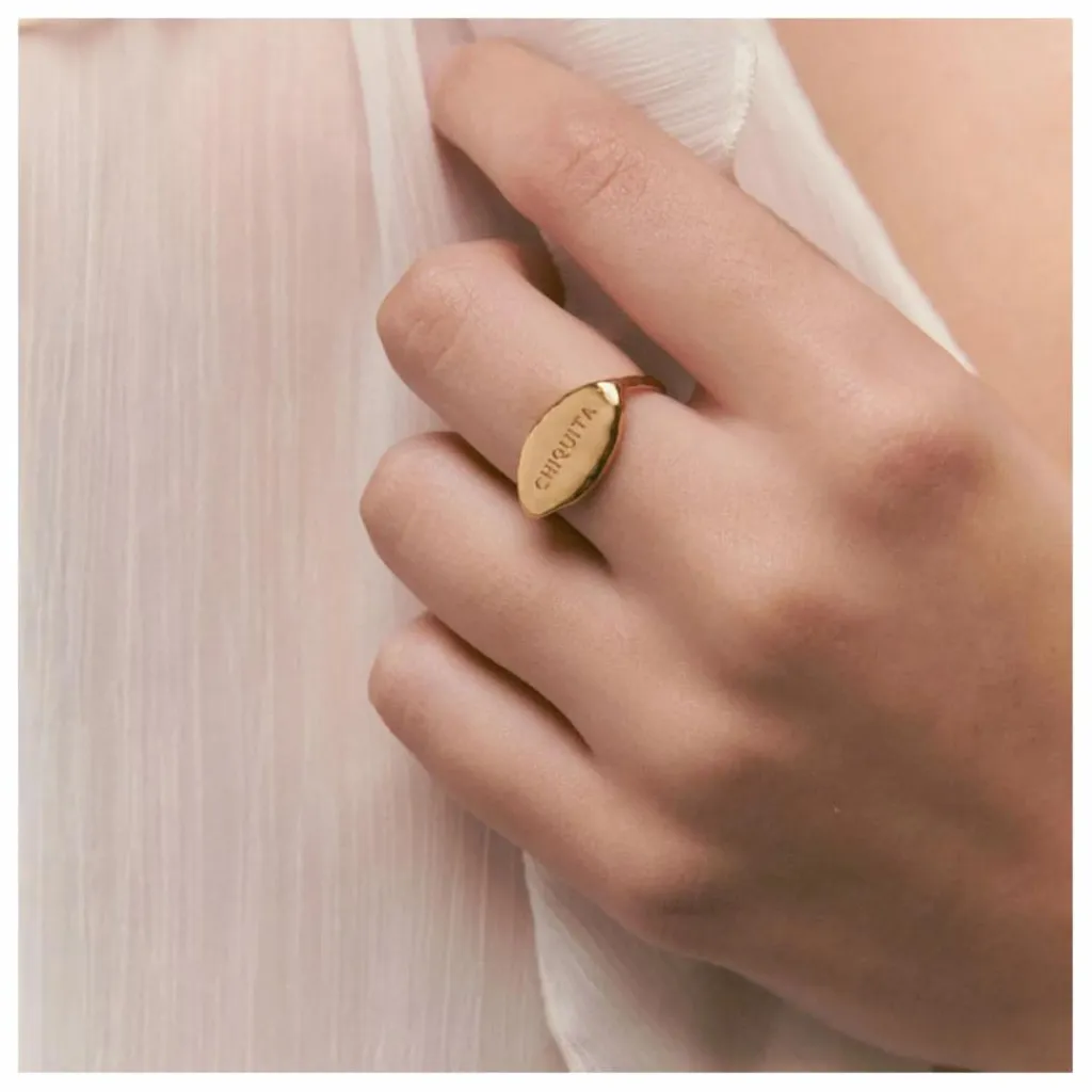 - Bague chevalière en or avec le mot Chiquita gravé sur le devant. Il s’agit d’un terme d’affection pour une personne spéciale, très répandu dans le sud de l’Espagne. Plus qu’une simple référence à la taille, Chiquita est synonyme de confiance et de tendresse.