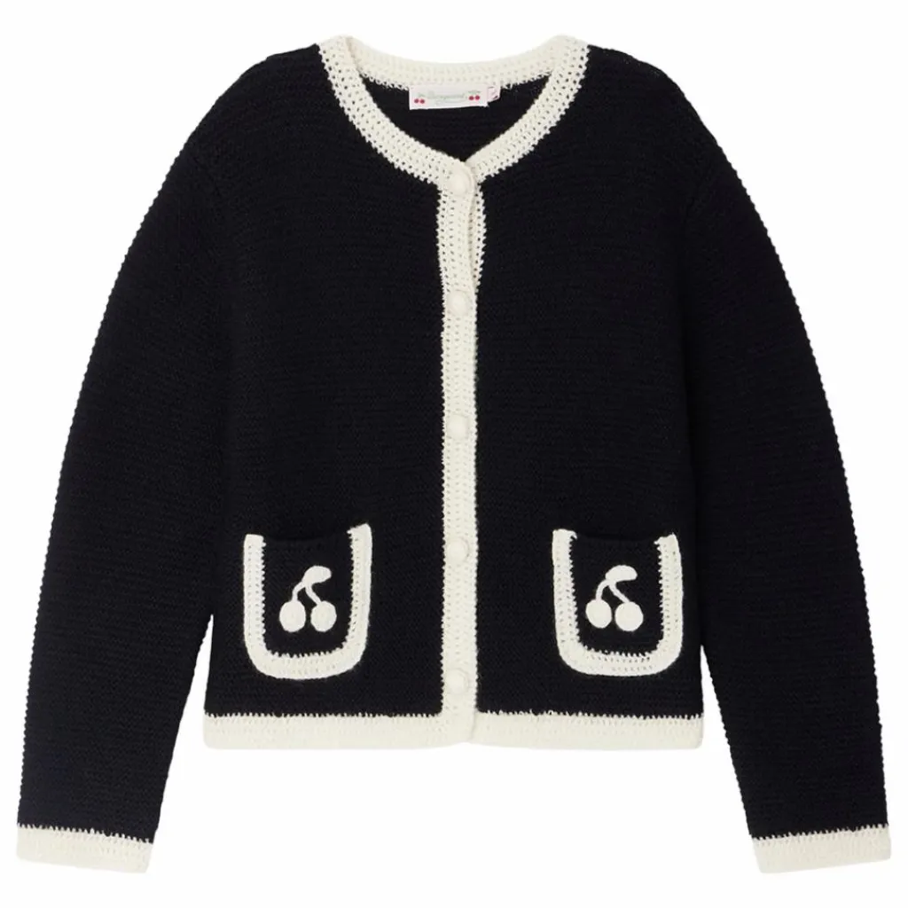 - Le cardigan Elaia pour fille s’illustre par ses détails en crochet, dont les cerises emblématiques de la Maison sur les poches. L’ouverture de ce modèle en laine se fait devant par des boutons assortis.En laine certifiée qui garantit le bien être animalCol rondPoches plaquées devant