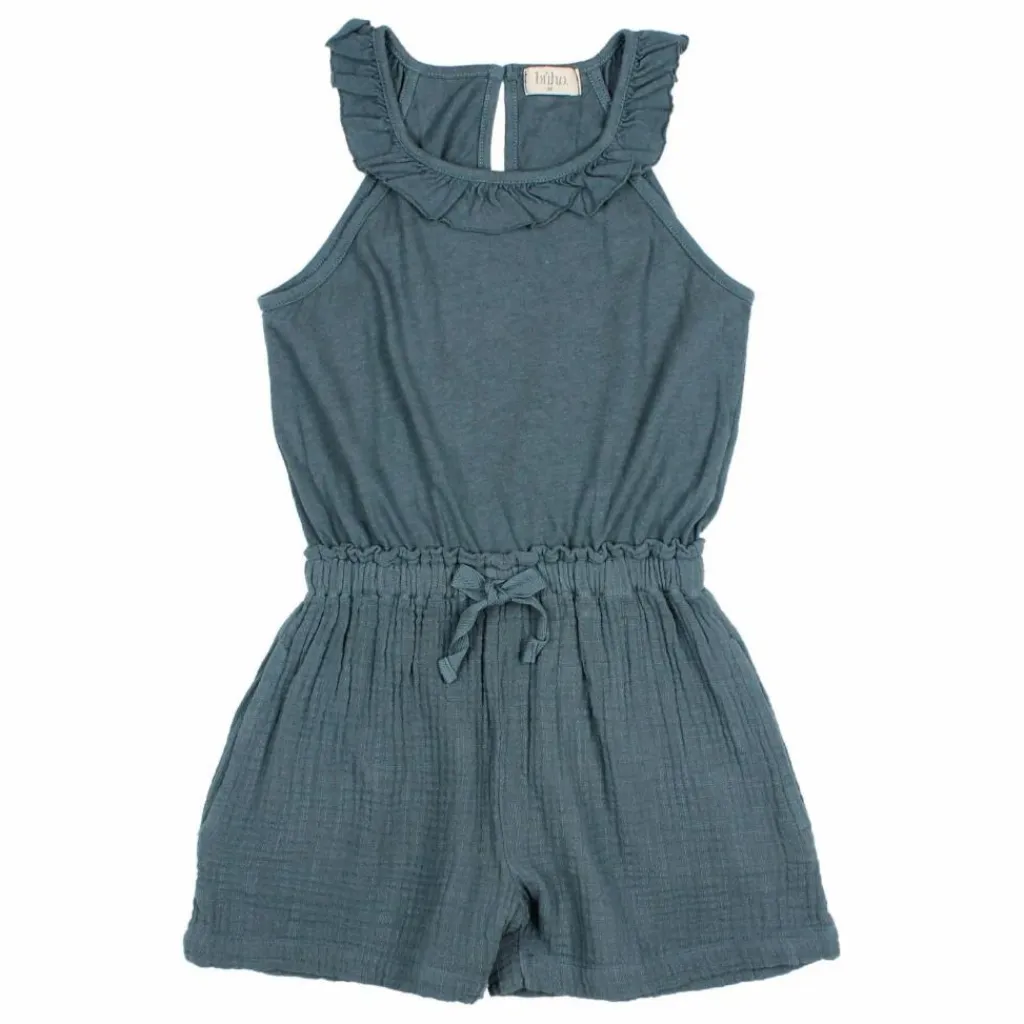 - Combinaison courte combinée. Haut en jersey de coton et lin. Encolure ronde avec volant. Fermeture goutte d’eau avec bouton au dos. Short en mousseline. Taille élastiquée avec dentelle décorative. Poches sur les coutures latérales.