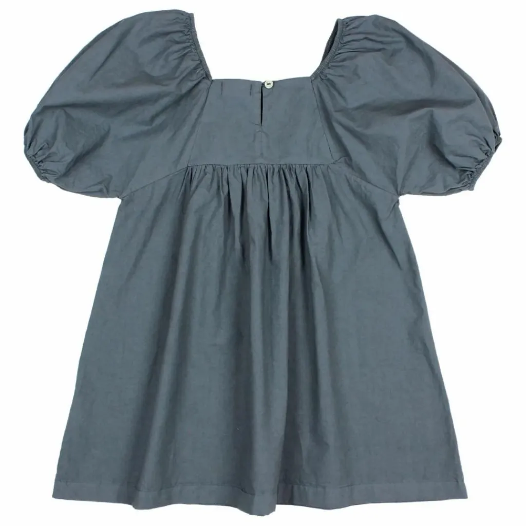 - Robe en popeline. Encolure droite. Fermeture en goutte d’eau avec bouton au dos. Épaules élastiquées. Manches bouffantes en ranglan. Bas à volants.