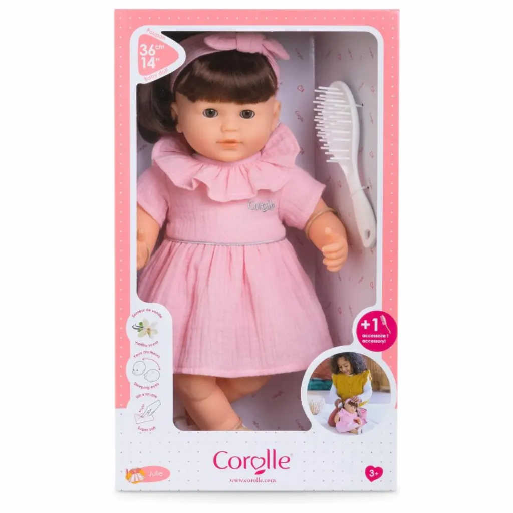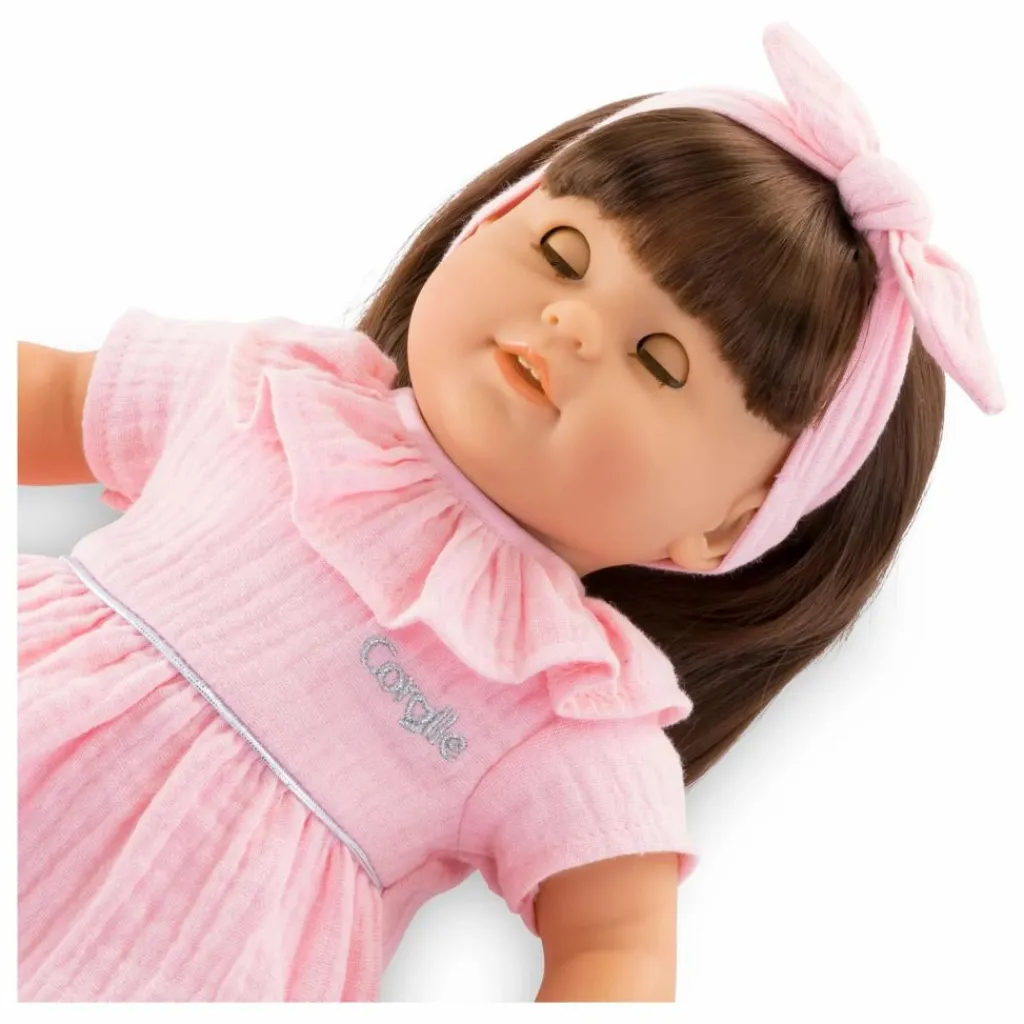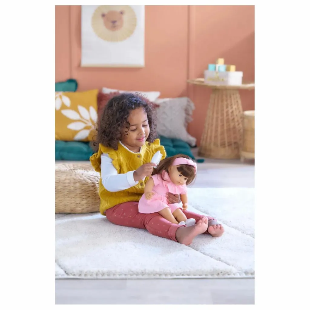 Elle porte une élégante tenue : une robe rose en gaze de coton, un bandeau assorti et des ballerines blanches. Julie est compatible avec les vêtements pour poupons de 36 cm et est idéale dès 3 ans.